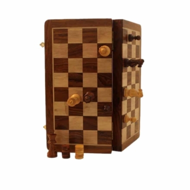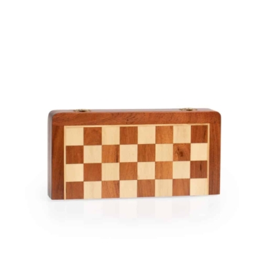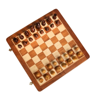 Das faltbare magnetische Reise-Schachspiel besteht vollständig aus Holz.