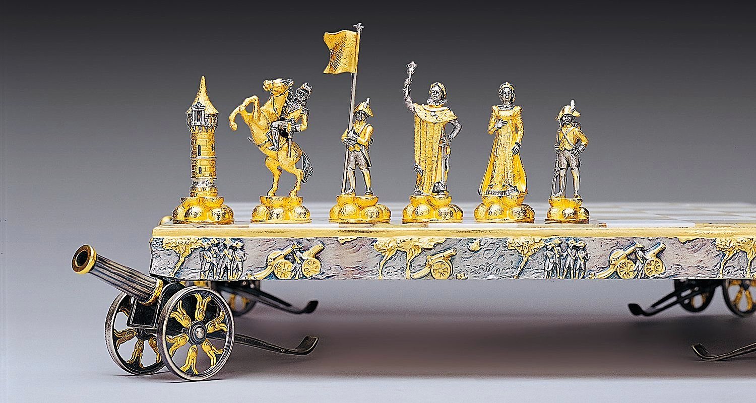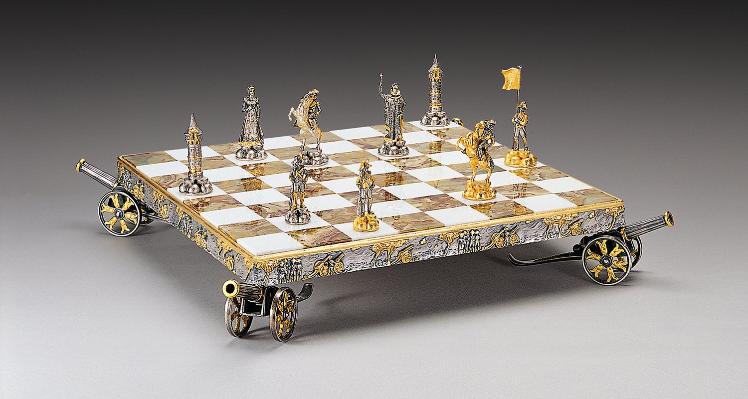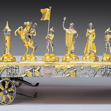 Das Schachbrett mit Füßen wird von fein skulptierten und vergoldeten Kanonen der damaligen Zeit gekrönt, die perfekt das Spielbrett schmücken, der Rand des Schachbretts wird durch Szenen aus Schlachten verziert.