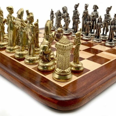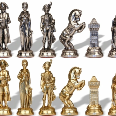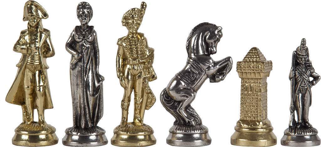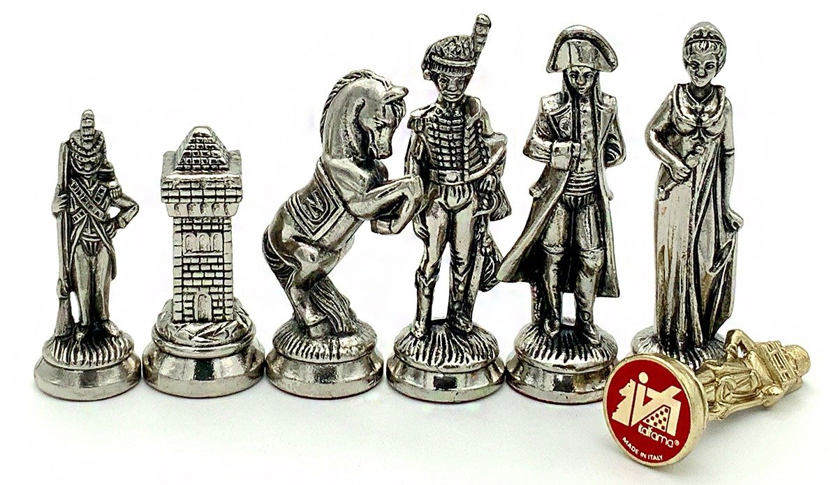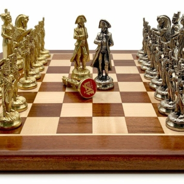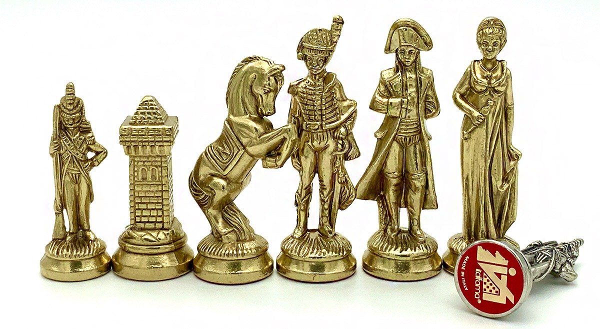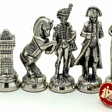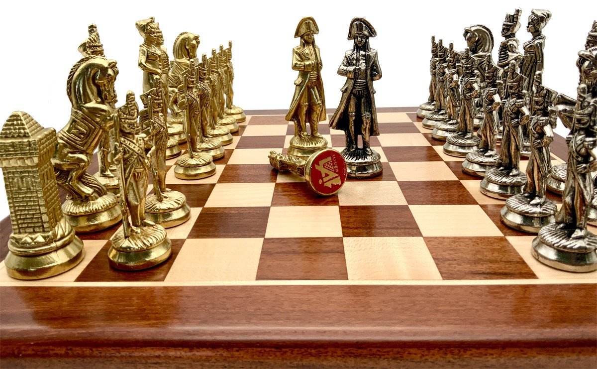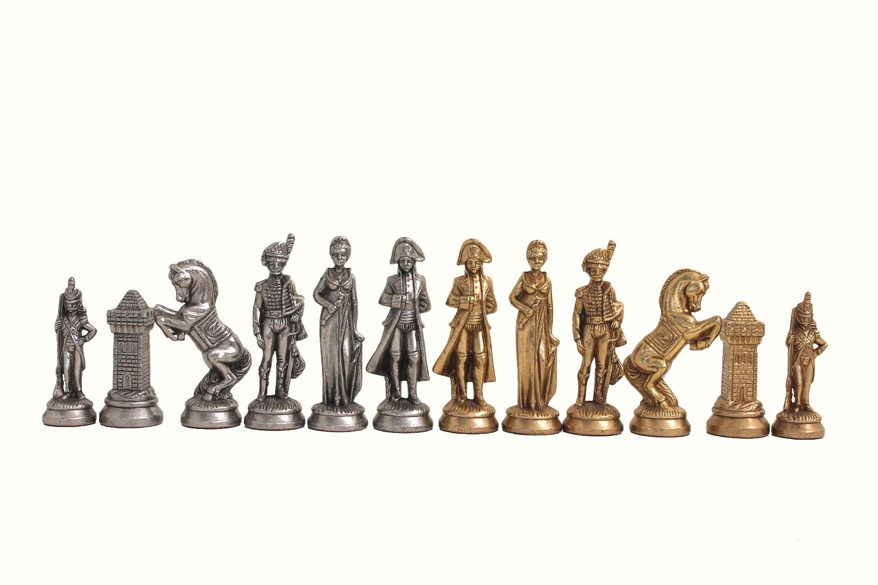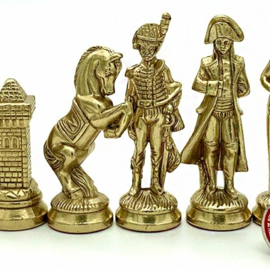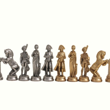 Die Schachfiguren dieses Sets sind inspiriert vom historischen Thema Napoleon. Natürlich ist Napoleon selbst vertreten, aber auch Joséphine und bei den markantesten Figuren wird der Reiter durch ein aufbäumendes Pferd dargestellt, das mit dem N von Napoleon verziert ist.