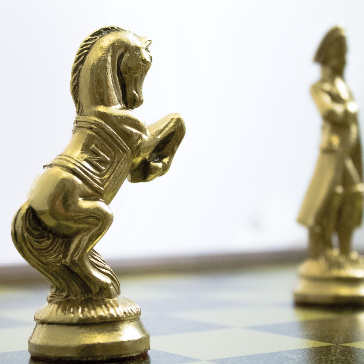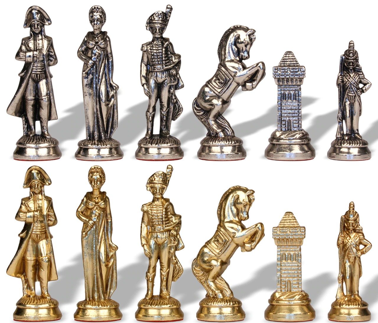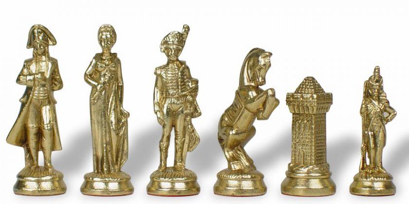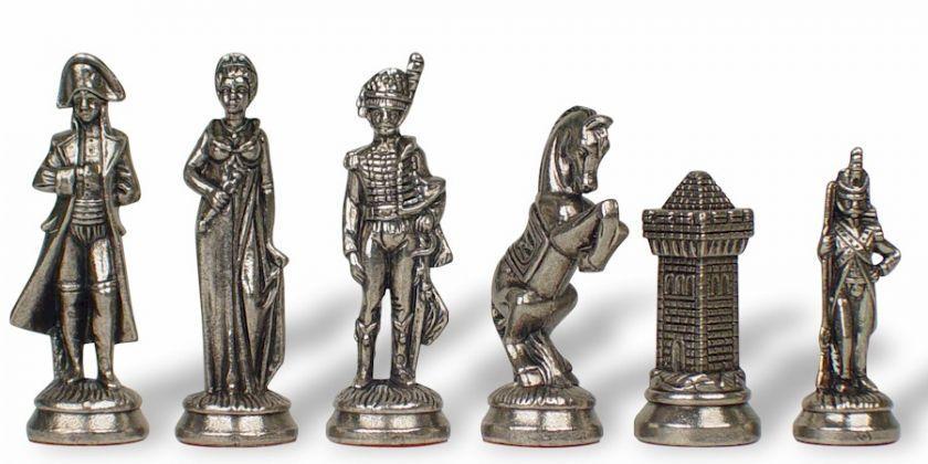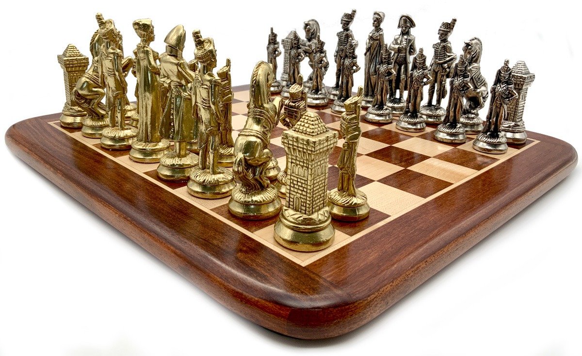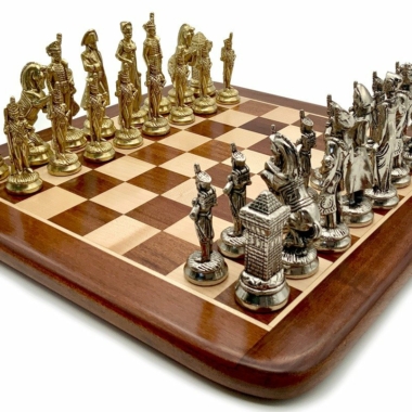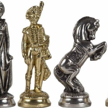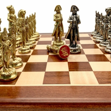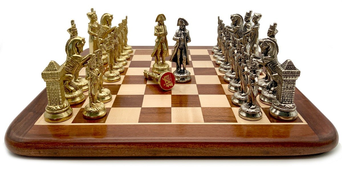 Die Schachfiguren dieses Sets sind inspiriert vom historischen Thema Napoleon. Natürlich ist Napoleon selbst vertreten, aber auch Joséphine und bei den markantesten Figuren wird der Reiter durch ein aufbäumendes Pferd dargestellt, das mit dem N von Napoleon verziert ist.
