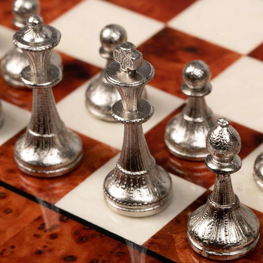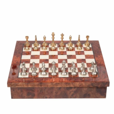 Wir bieten Ihnen für dieses kompakte Set ein Schachspiel aus gold- und silberbeschichtetem Metall im Staunton-Stil und ein Schachbrett aus massivem Ulmen- und Heideholz.