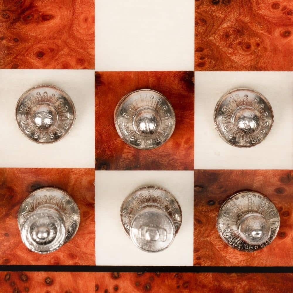 Das Schachbrett aus massivem Ulmen- und Heideholz bleibt klassisch, passt aber perfekt zum Schachspiel aus Gold- und Silberbeschichtung und wertet es zusätzlich auf.