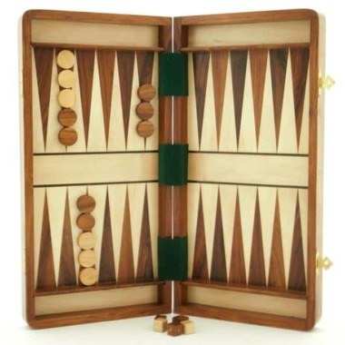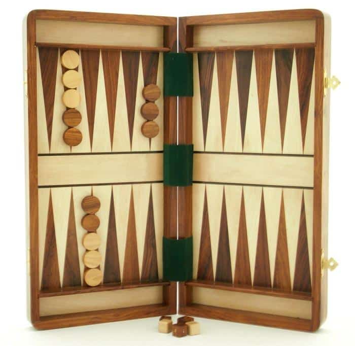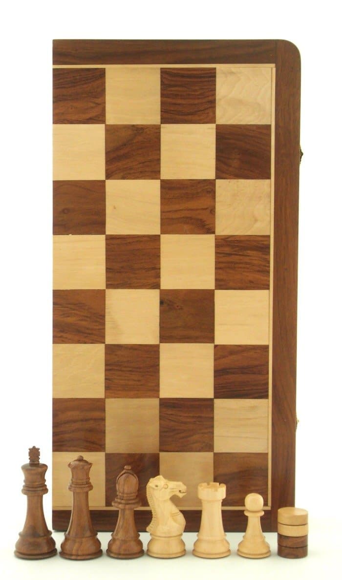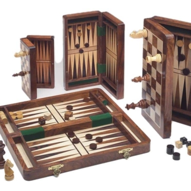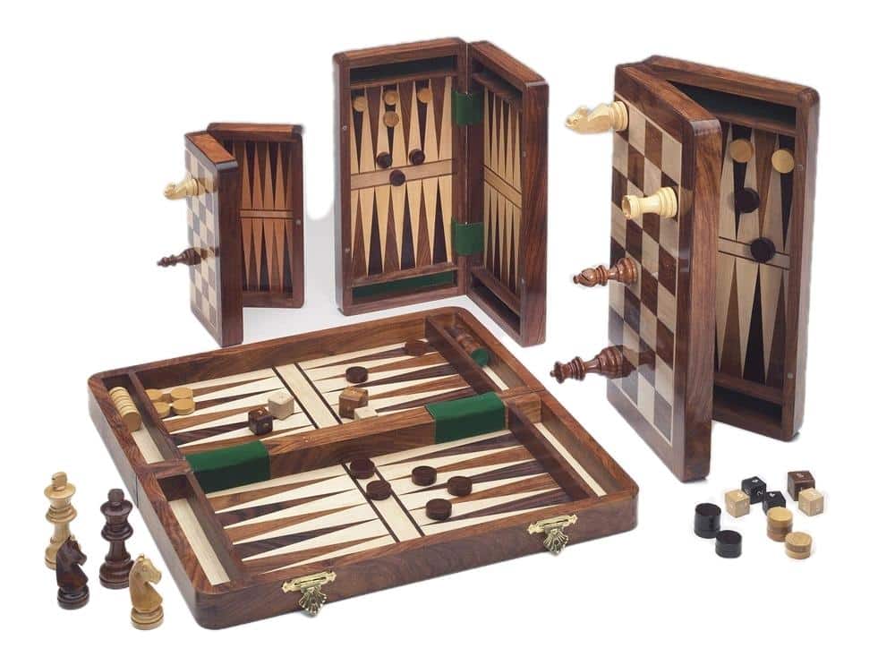 Zusätzlich zum Schachfiguren-Set wird ein Dame-Spielset mitgeliefert, und die Innenseite des Brettes ermöglicht das Spielen von Backgammon.