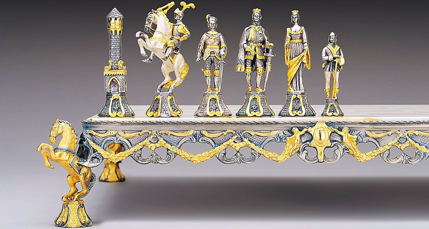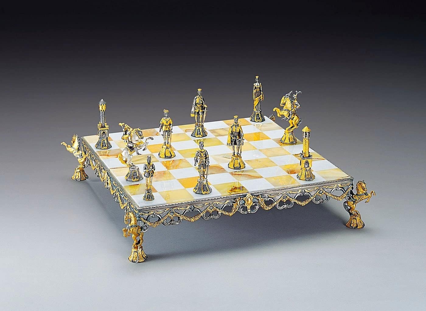 Oberfläche : 24 Karat Gold. Die Füße des Schachbretts sind in Form von Pferdeskulpturen gestaltet, die sich auf einem Sockel aufrichten.