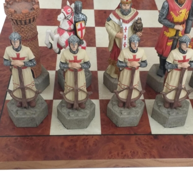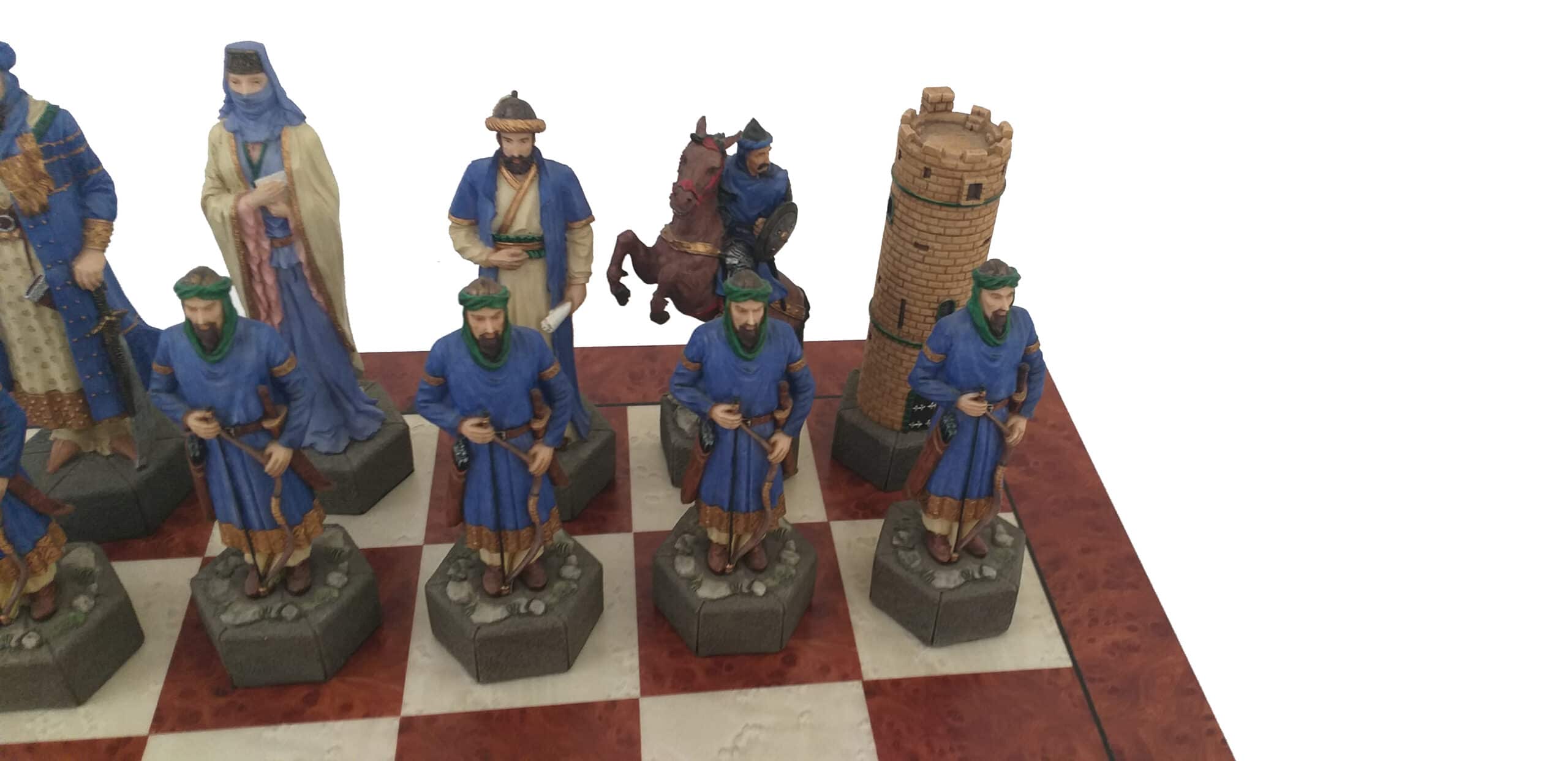 Das Set aus Harz-Schachfiguren ist inspiriert von den Kreuzzügen. Mit einer sehr großen Königshöhe von 17 cm verfügen sie über zahlreiche Details und sind vollständig handbemalt.