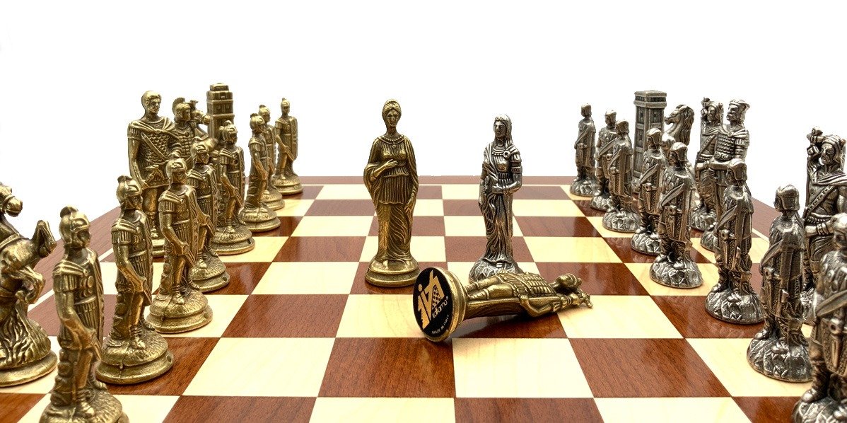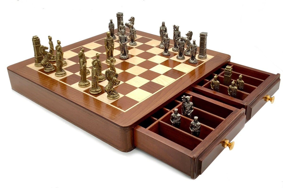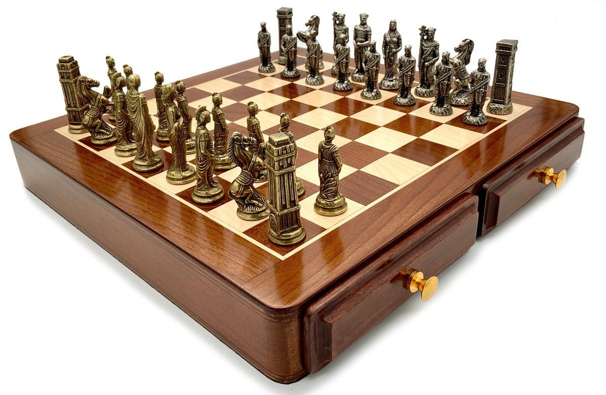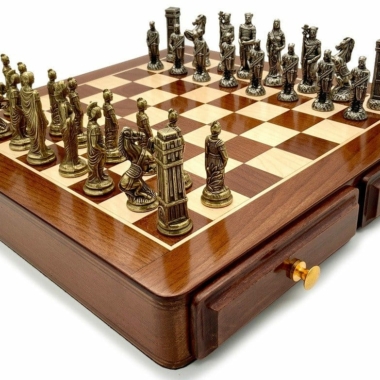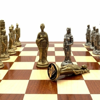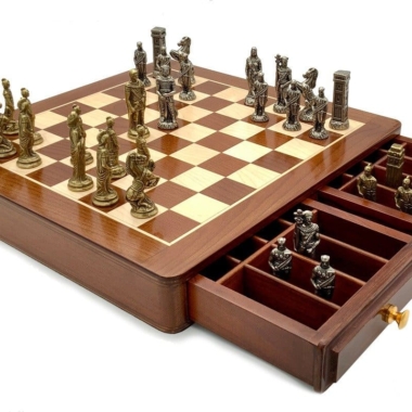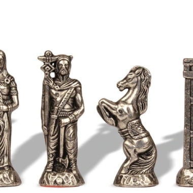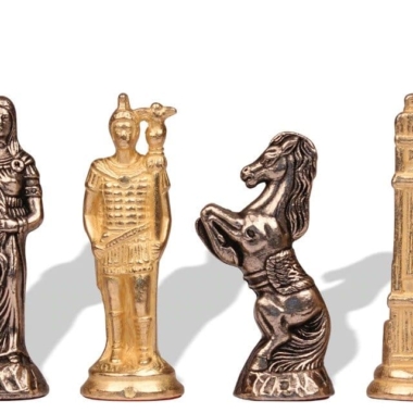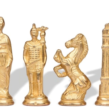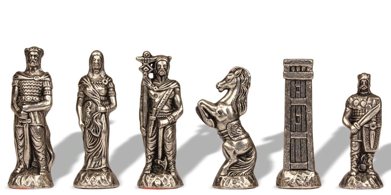 Die Schachfiguren sind aus Metall gefertigt, handgeschnitzt und -graviert; sehr elegant, stellen sie die römischen Legionen in ihrem erbitterten Kampf gegen die barbarischen Truppen dar.
