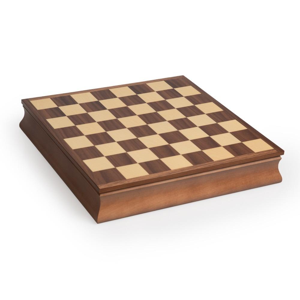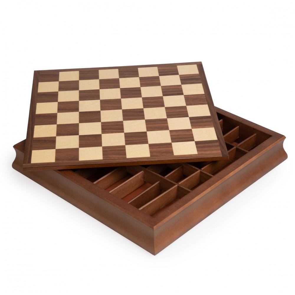 Das Schachbrett ist aus Nussbaum- und Ahornholz gefertigt, die Spielfläche hebt sich, um im Inneren des Schachbretts ein Aufbewahrungskästchen zu entdecken, das mit Leder ausgekleidet und individuell für jede Figur ist, um Ihre gesamten Figuren zu verstauen. Ein echtes kleines Kunsthandwerksjuwel aus Holz.