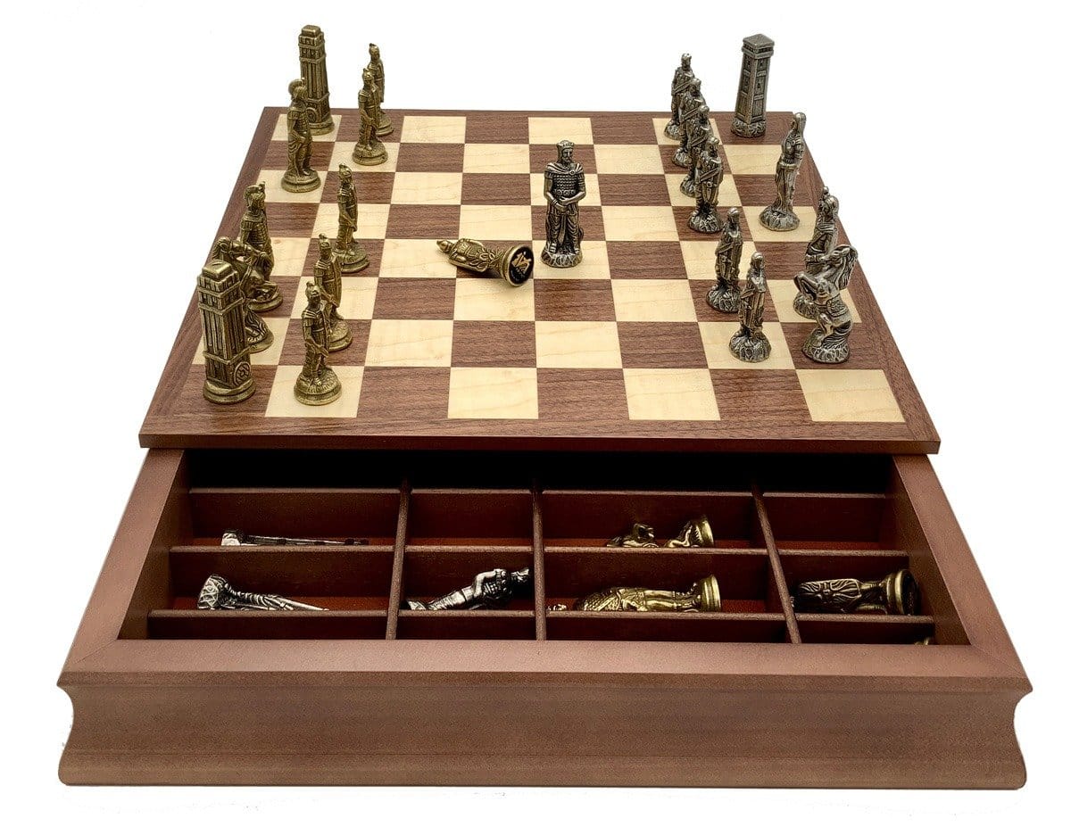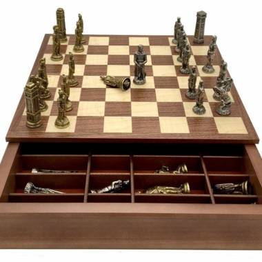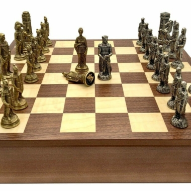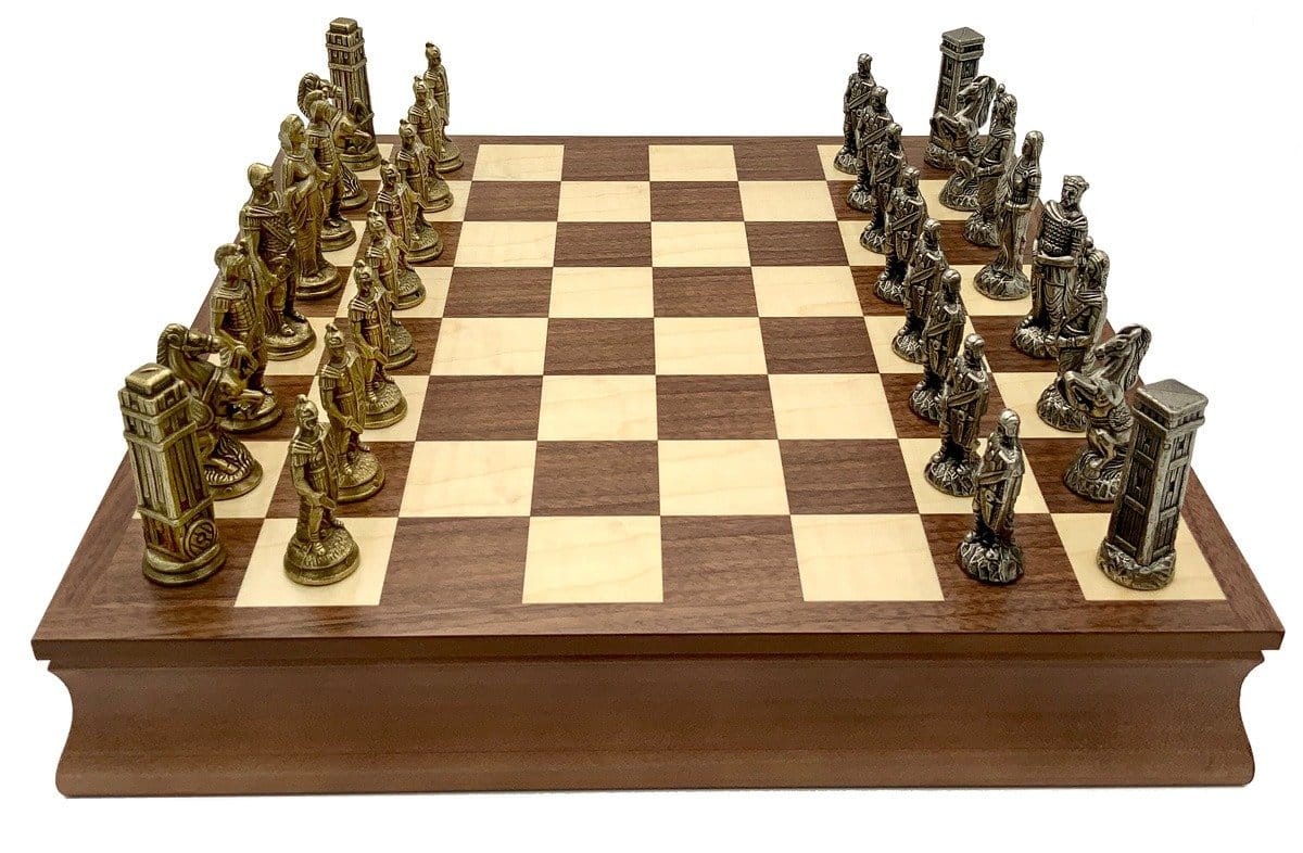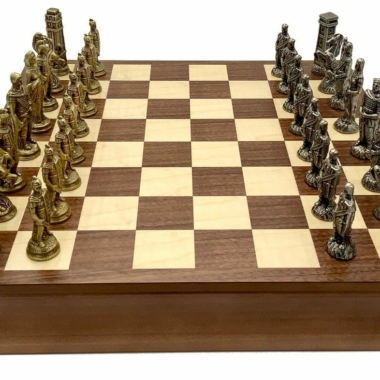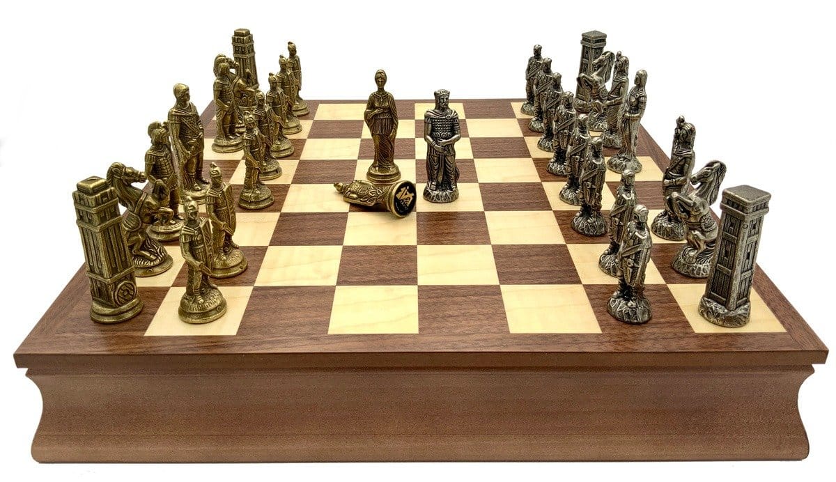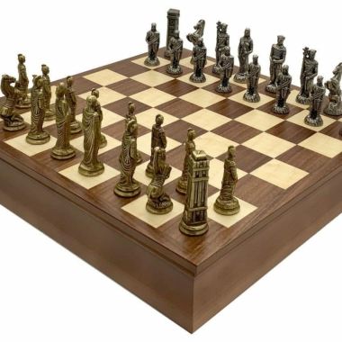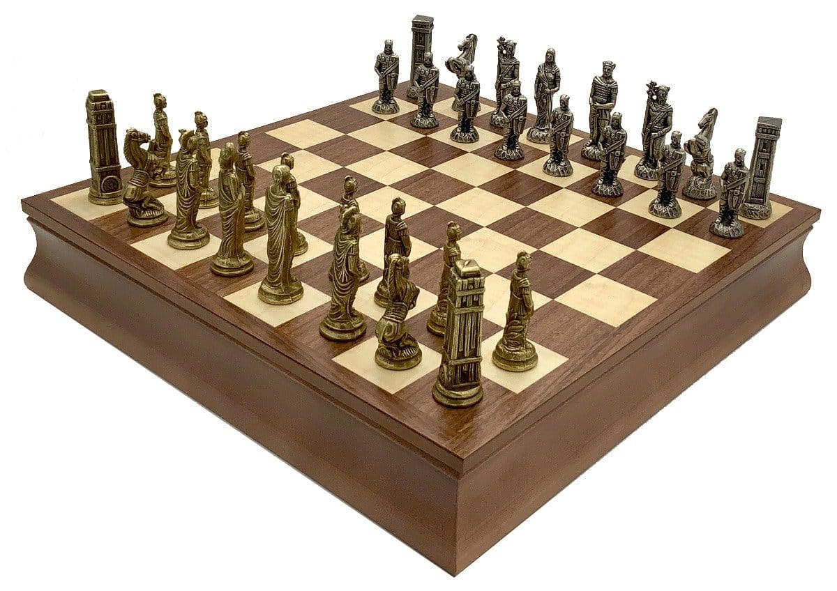 Die Schachfiguren sind aus Metall gefertigt, handgeschnitzt und -graviert; sehr elegant, stellen sie die römischen Legionen in ihrem erbitterten Kampf gegen die barbarischen Truppen dar.