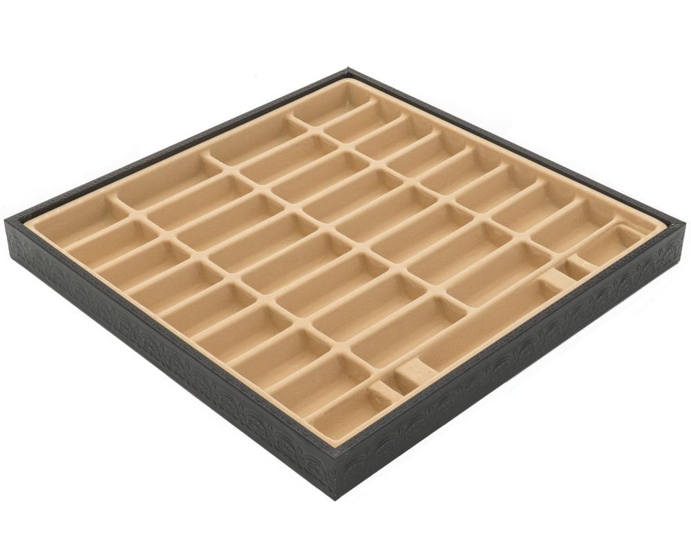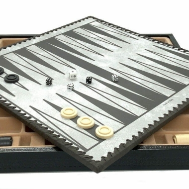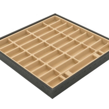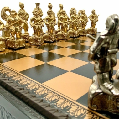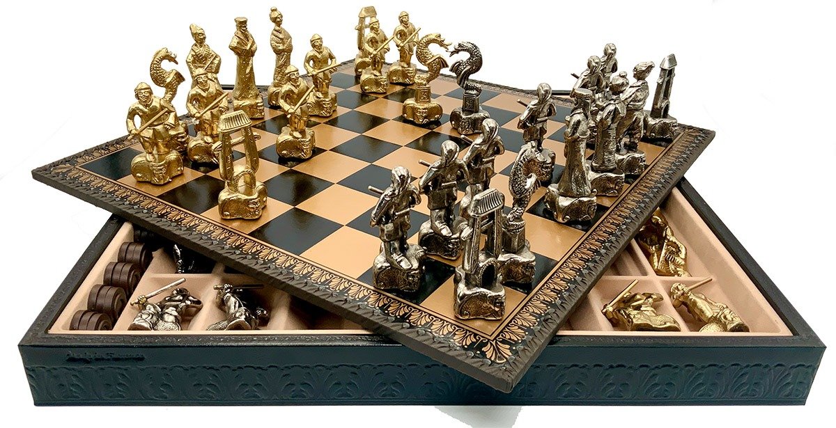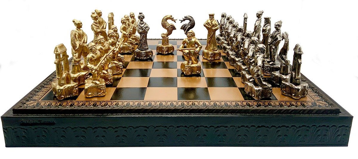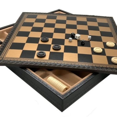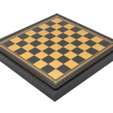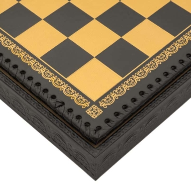 Das Schachbrett aus schwarzem und goldenem Kunstleder ist groß, mit 48 x 48 cm und beinhaltet unter dem abnehmbaren Spielbrett ein gefilztes und individuelles Aufbewahrungsfach für jede Figur.