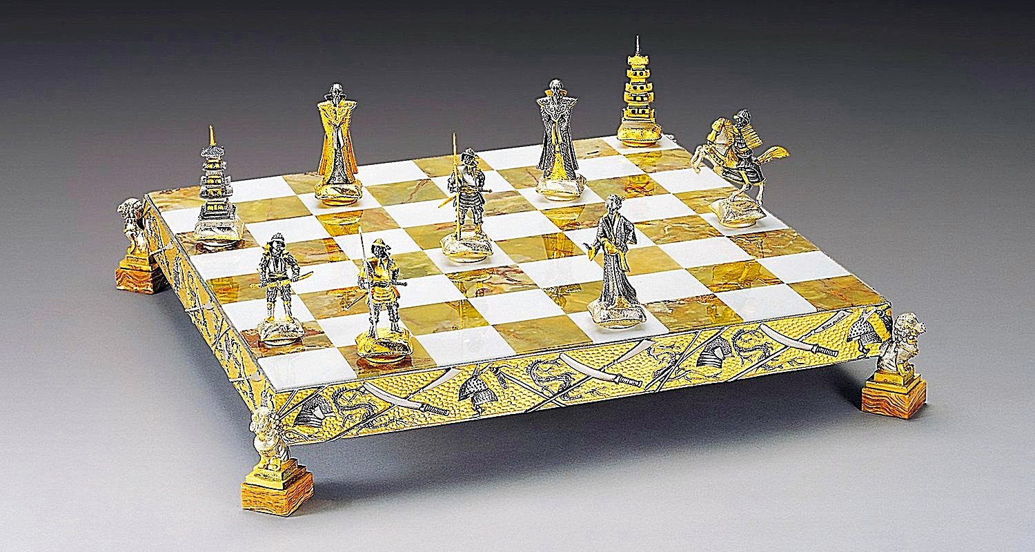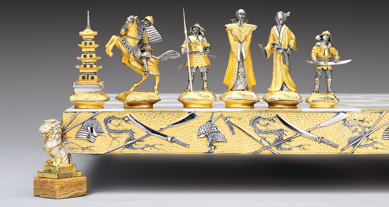 Oberfläche : 24 Karat Gold. Die Füße des Schachbretts sind in Form von chinesischen Drachen gestaltet.