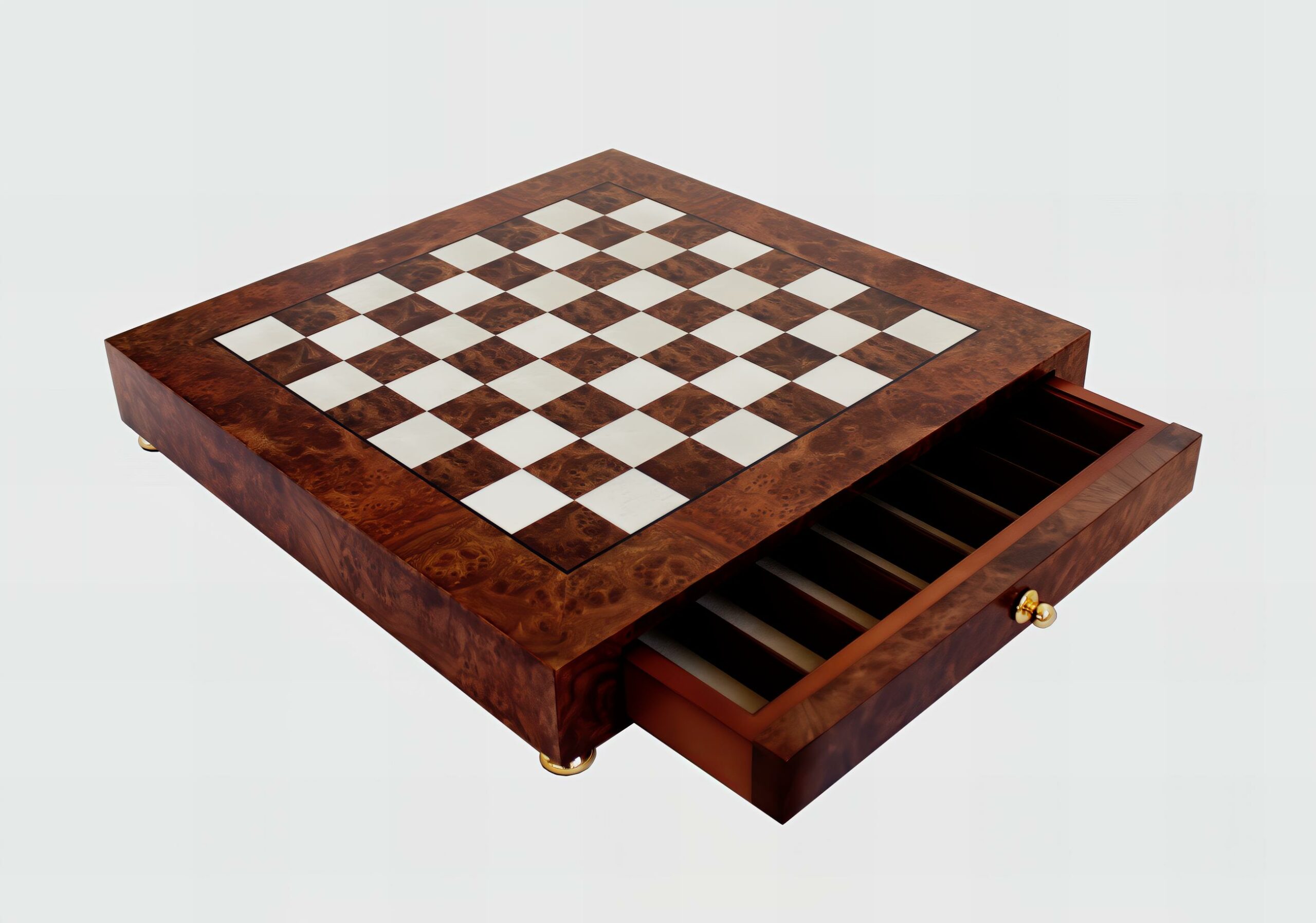 Schachbrett auf Holzfuß mit Aufbewahrungsschublade
