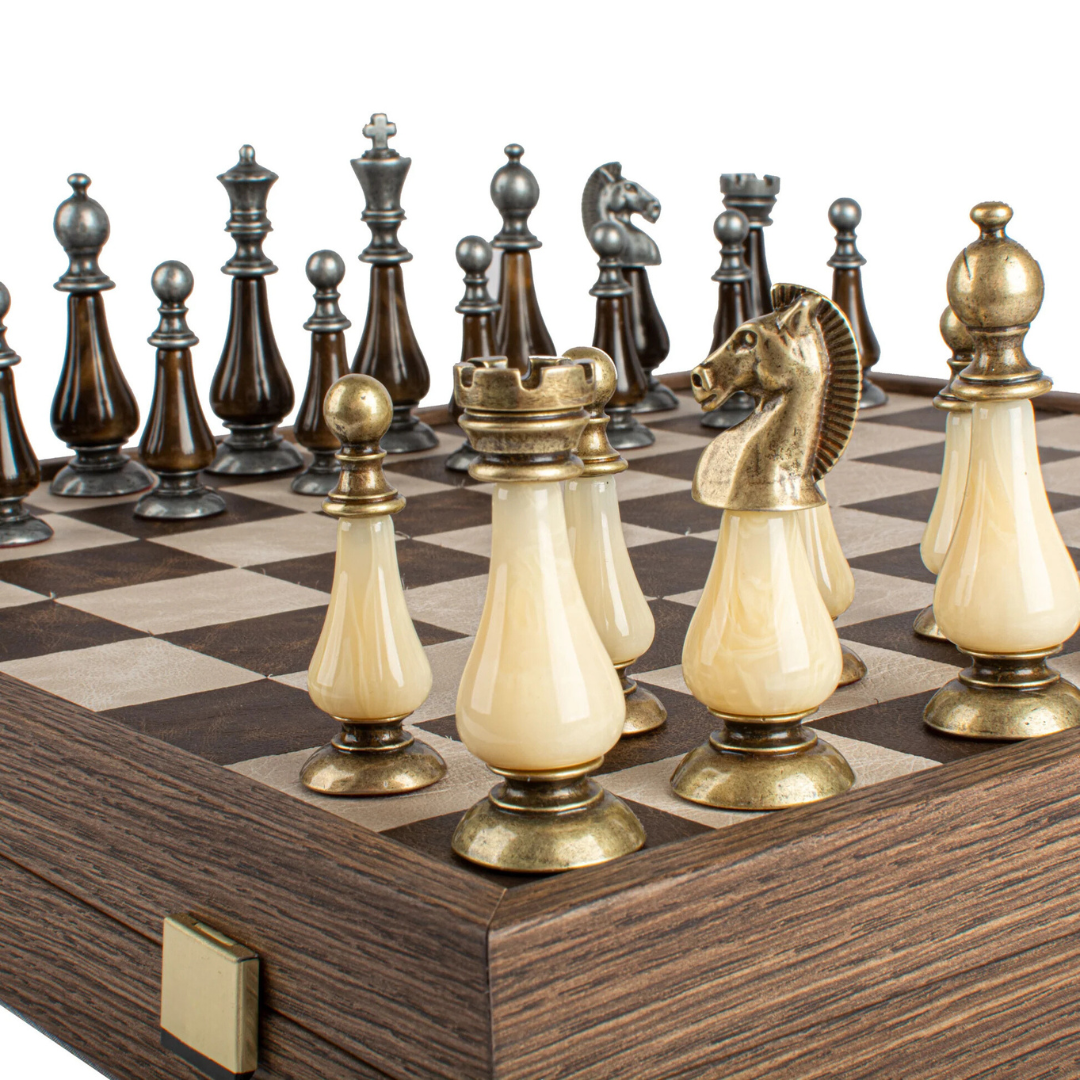 | Materiau Pieces Echecs | Laiton et étain avec éléments en nacre |