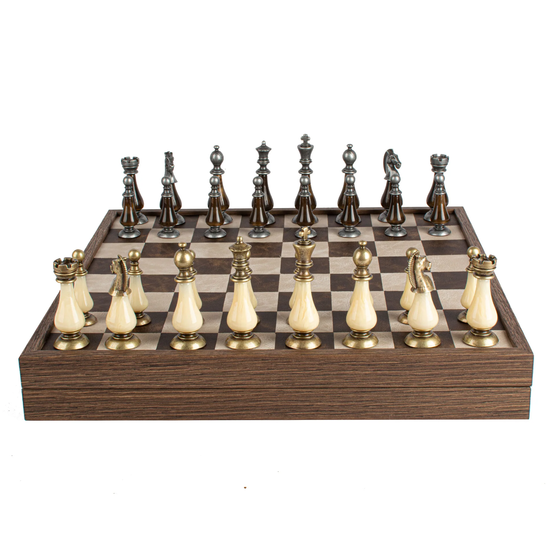 Schachbrett Spielplatte aus Braun/Elfenbein Leder und Schachfiguren aus Messing und Zinn mit Aufbewahrung – 50×50 cm