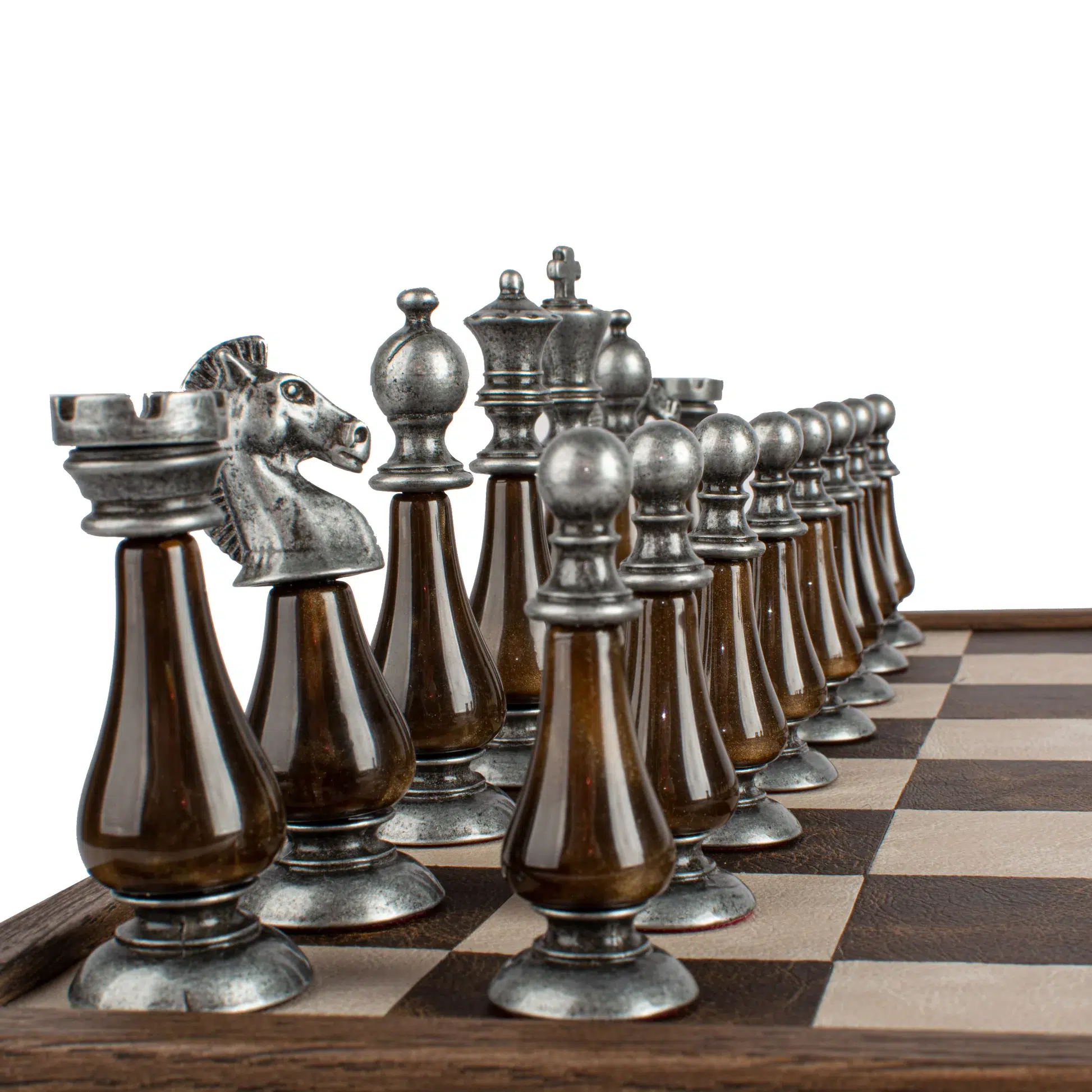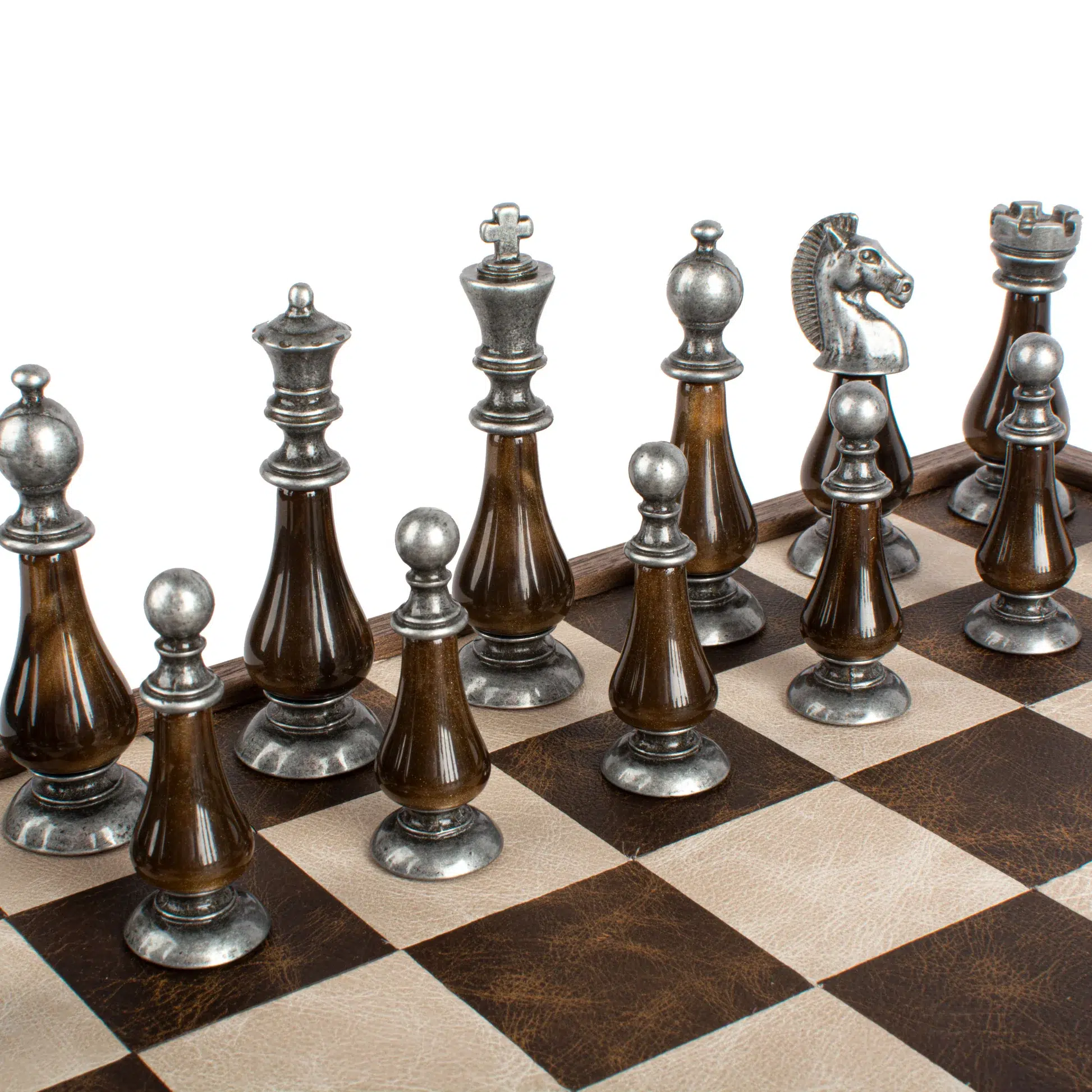 Tauchen Sie ein in die Eleganz dieses wunderschönen Schachspielsets, mit einem Schachbrett aus hochwertigem braunem und elfenbeinfarbenem Leder, das 50 x 50 cm misst und eine sowohl reiche als auch distingierte Spielfläche bietet.
