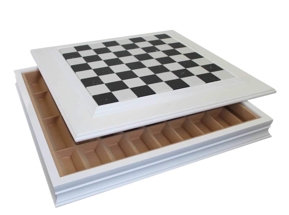 Schachbrett aus lackiertem Holz und Spielbrett aus schwarz-weißem Marmor mit Aufbewahrung