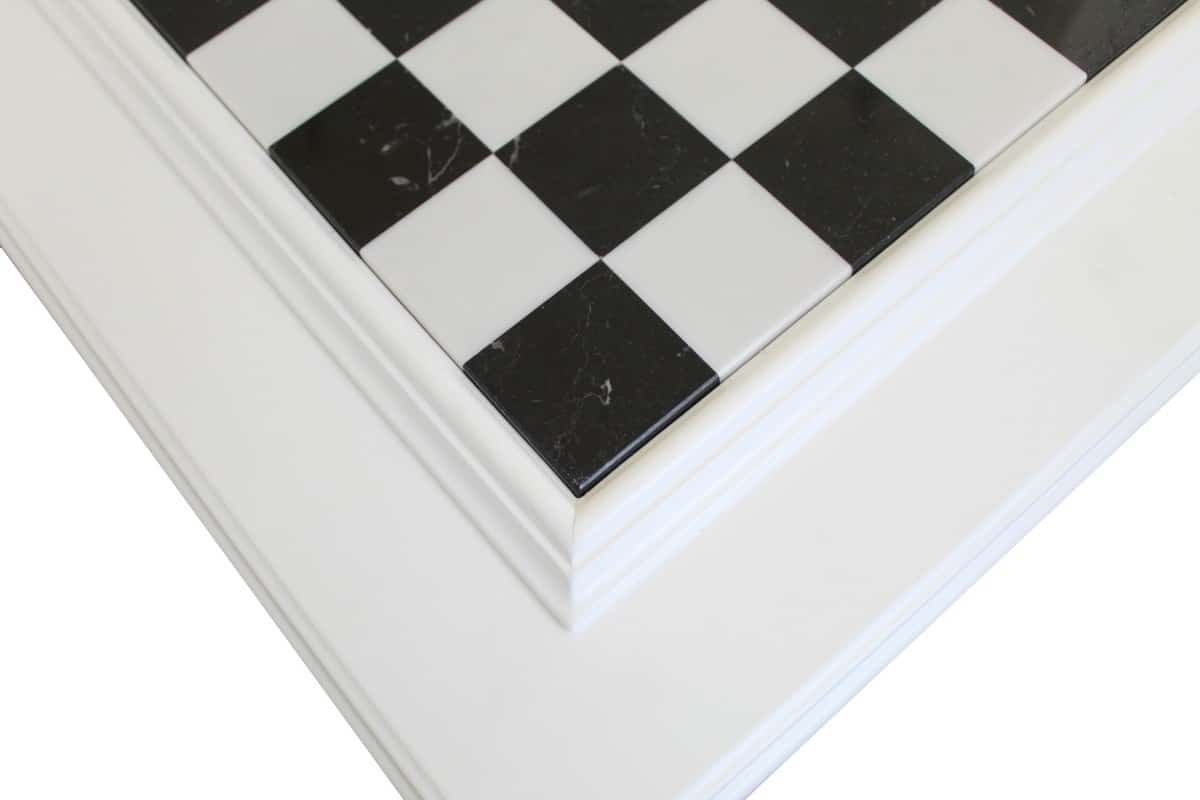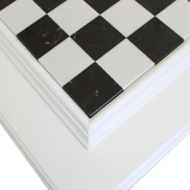Das Schachbrett ist ein wahres Wunder, handgefertigt von einem italienischen Handwerker, der auf die Herstellung von Schachspielen spezialisiert ist. Die Basis besteht aus weiß lackiertem Holz mit einem profilierten Rahmen und das Spielbrett ist aus schwarz-weißem Marmor.