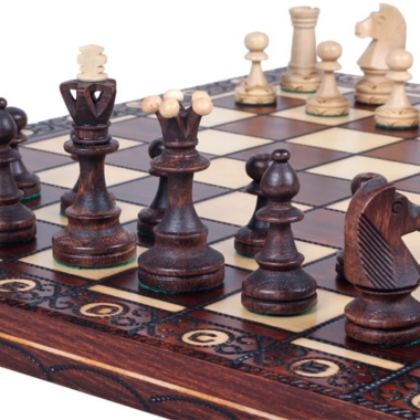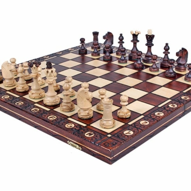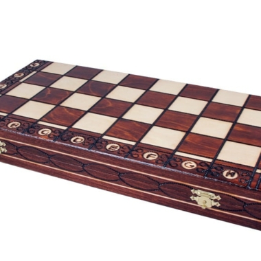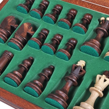 Das faltbare Schachbrett aus Birkensperrholz und Buchenholz, in Standardgröße 42 x 42 x 2,5 cm geöffnet (42 x 21 x 5 cm geschlossen), verfügt über ein separates Fach für die Aufbewahrung der Schachfiguren im Inneren.