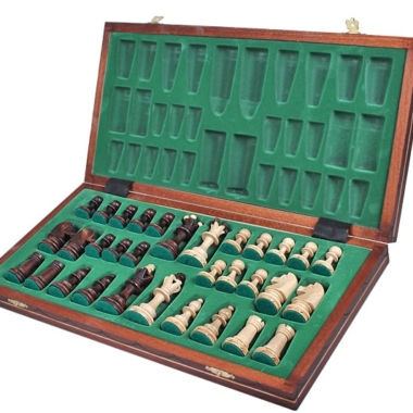 Schachfiguren aus Holz und faltbares Schachbrett mit Aufbewahrung