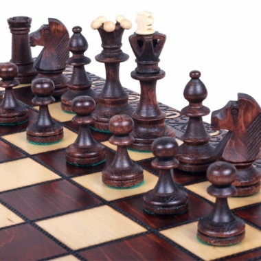 Die beschwerten Schachfiguren sind aus Ahorn- und Sykomorenholz, vollständig handgefertigt, haben eine Höhe des Königs von 8,5 cm.