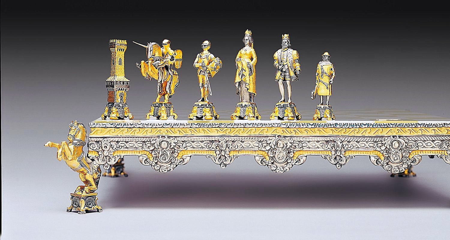 Oberfläche : 24 Karat Gold. Die Füße des Schachbretts sind als Pferdeskulpturen gestaltet.