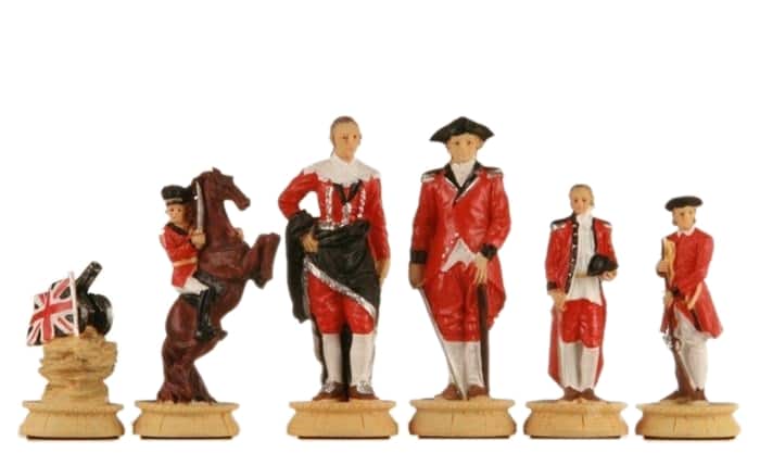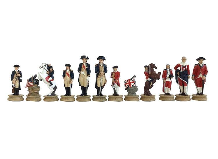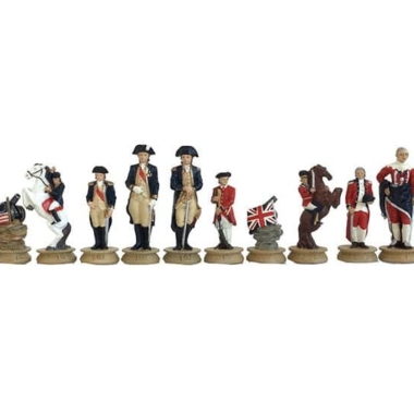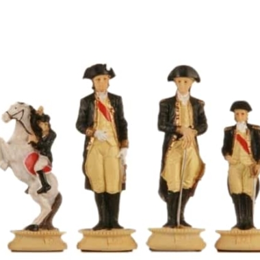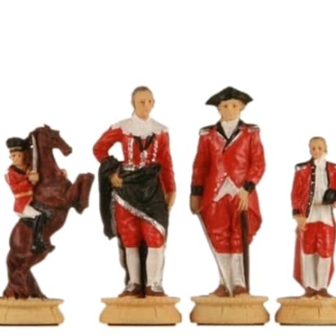 Die handgeschnitzten und handbemalten Zinnfiguren sind wunderschön, mit einer Höhe des Königs von 8 cm erwachen sie zwischen Ihren Fingern zum Leben. Gut gewichtet lassen sie sich angenehm über das Spielbrett bewegen. Sie sind im Thema der Amerikanischen Revolution gestaltet.