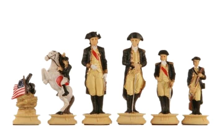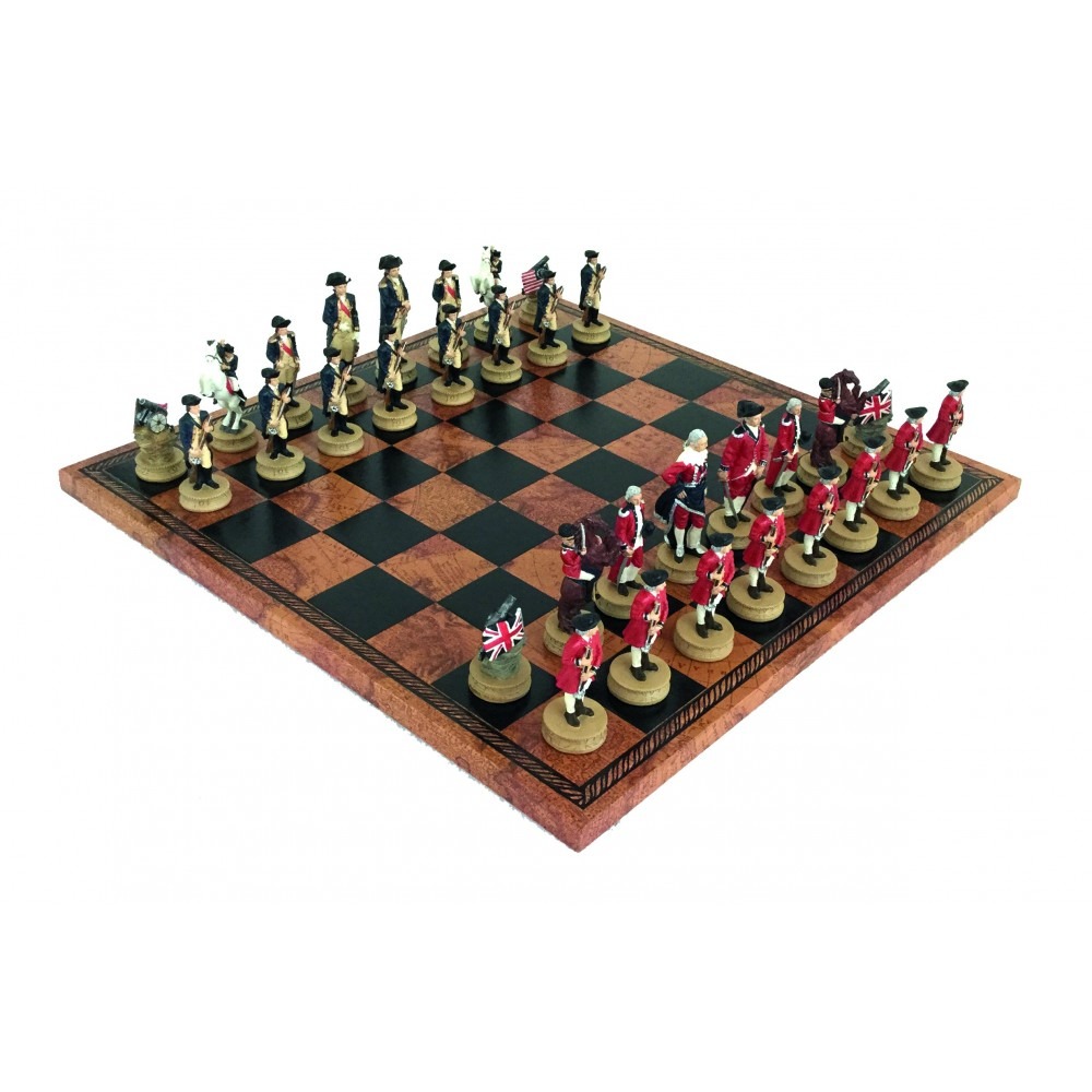 Schachspiel Amerikanische Revolution aus Zinn und Schachbrett aus Kunstleder