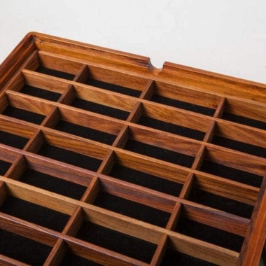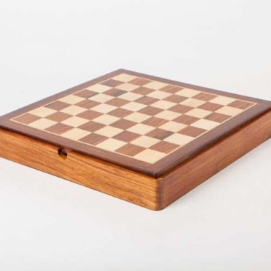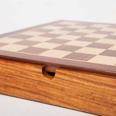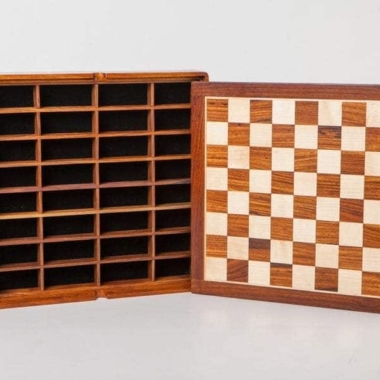 Das Schachbrett hat die Abmessungen 37 x 37 cm und ist aus goldenem Palisander (goldenes Rosenholz) gefertigt. Die Spielfläche lässt sich anheben, um ein individuelles Aufbewahrungsfach für jede Figur zu entdecken.