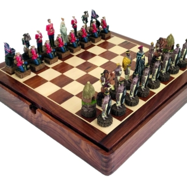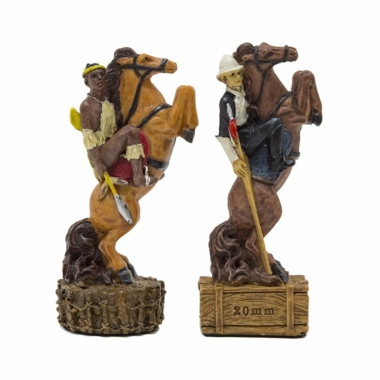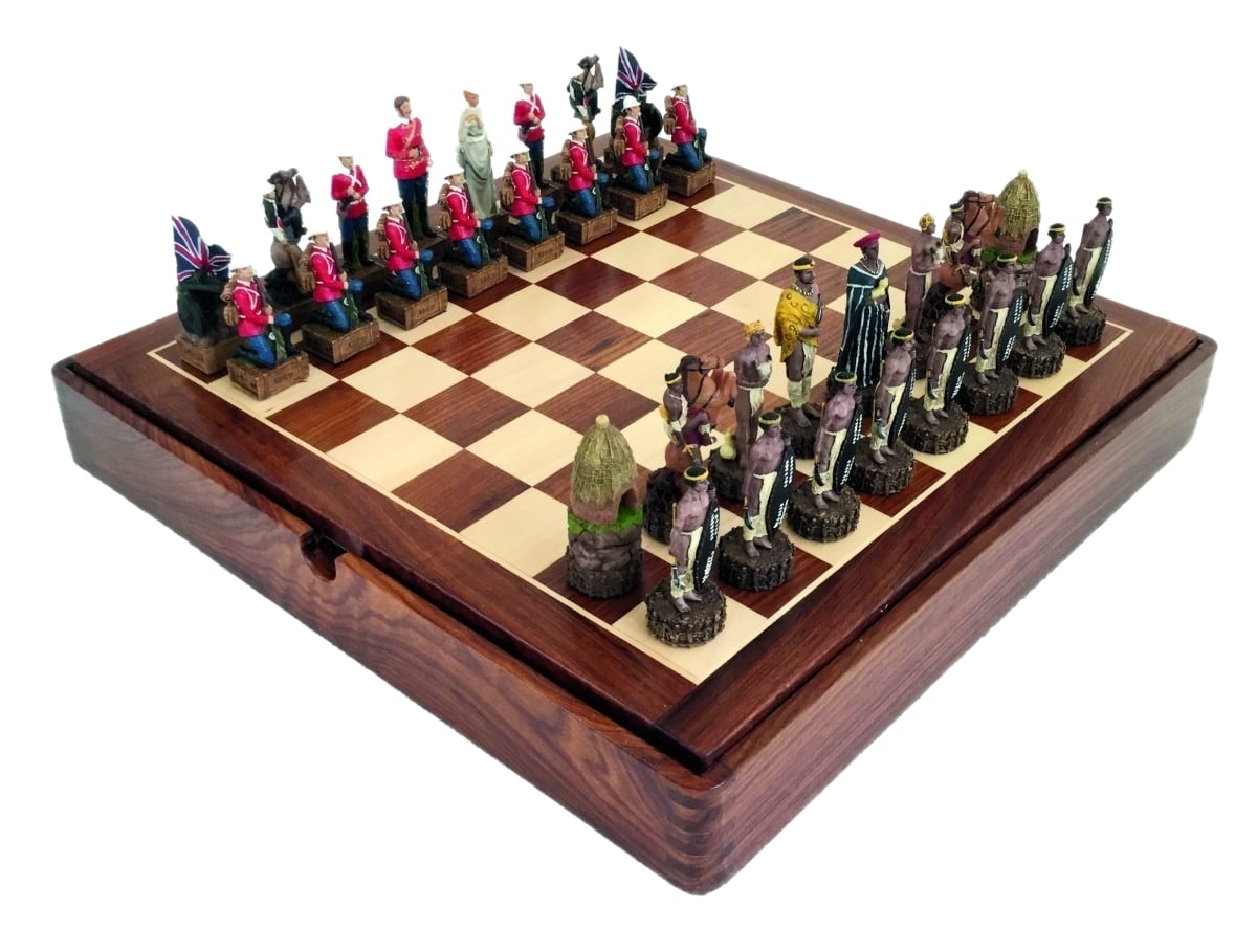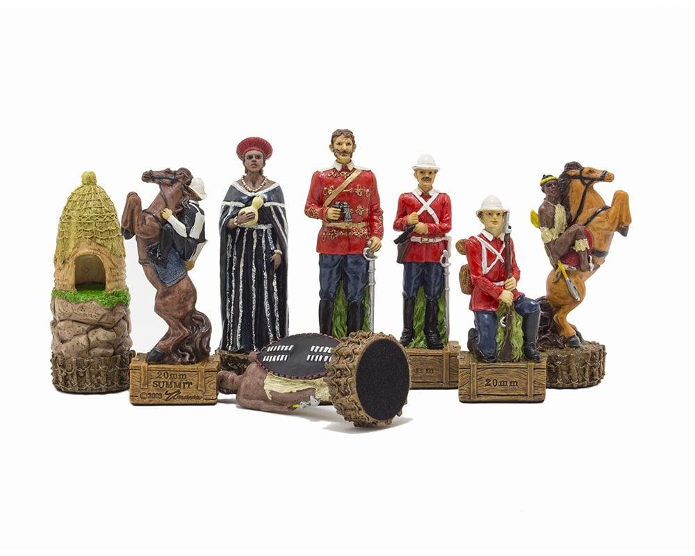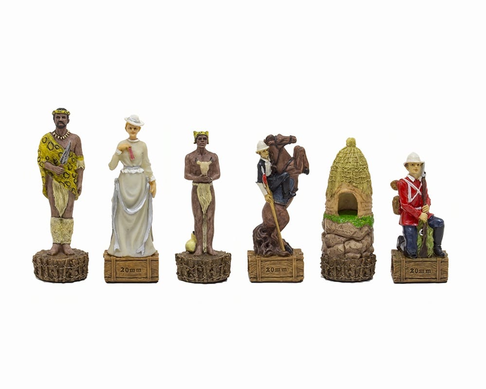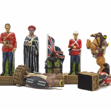 Die Figuren des Schachspiels aus Harz sind inspiriert vom Anglo-Zulu Krieg, der 1879 zwischen dem Vereinigten Königreich und den Zulus stattfand. Mit einer Höhe des Königs von 8 cm sind die Figuren vollständig handbemalt.