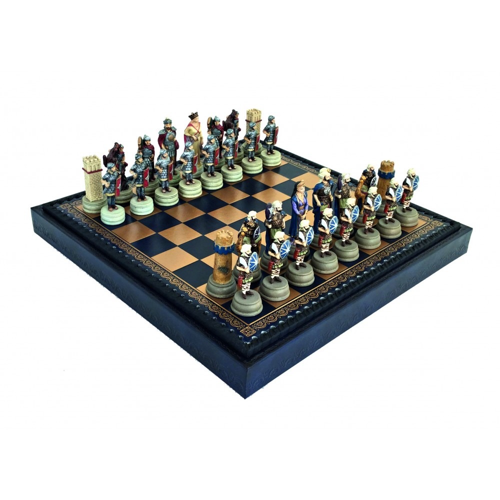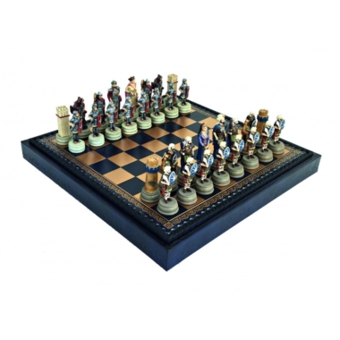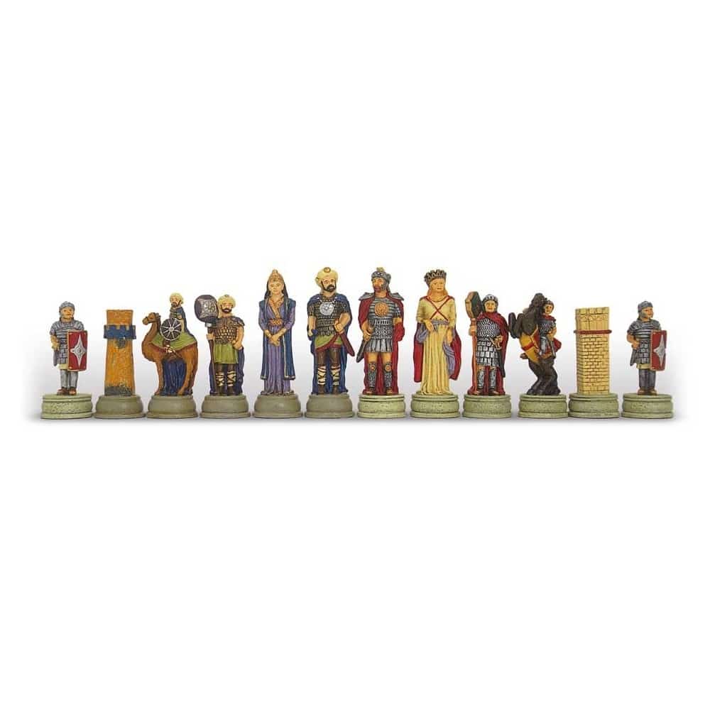 Die Schachfiguren sind im Thema der arabisch-byzantinischen Kriege gestaltet, die eine Reihe von Kriegen zwischen den arabischen Kalifaten und dem Byzantinischen Reich zwischen dem 7. und 12. Jahrhundert waren. Sie sind aus Zinn und handbemalt, die Figuren sind wunderschön. Mit einer Höhe des Königs von 8 cm sind sie gut gewichtet.