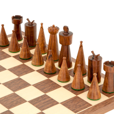 Die Farben von Rosenholz und Nussbaum sind ähnlich und harmonieren sehr gut. Das Schachbrett ist mit einem satinierten Lack überzogen, der den subtilen Glanz der Figuren hervorhebt.