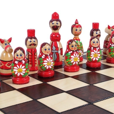 Ein schönes Set aus Schachspiel aus Holz zum Thema der russischen Puppen in Blau und Rot, das Kinder begeistern wird.
