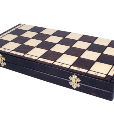 Sie sind ergänzt durch ein Schachbrett aus Buchen- und Birkenholz mit alphanumerischen Markierungen, mit einer Größe von 42 x 42 x 2,75 cm geöffnet (42 x 21 x 5,5 cm gefaltet). Das Spielbrett ist faltbar und verfügt über einen individuellen Stauraum für jede Figur.