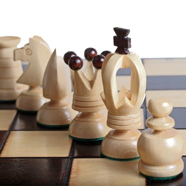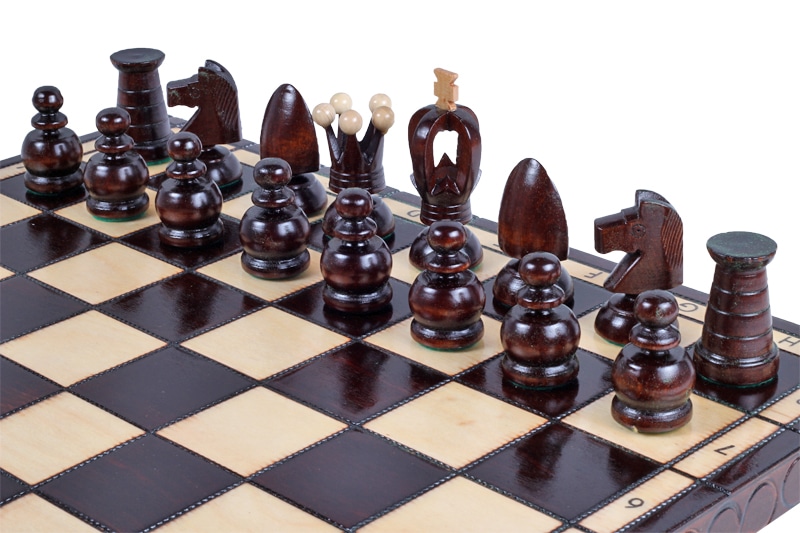 Schachspiel aus Holz und faltbares Schachbrett mit alphanumerischen Holzmarkierungen