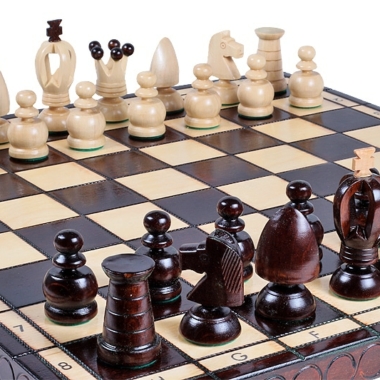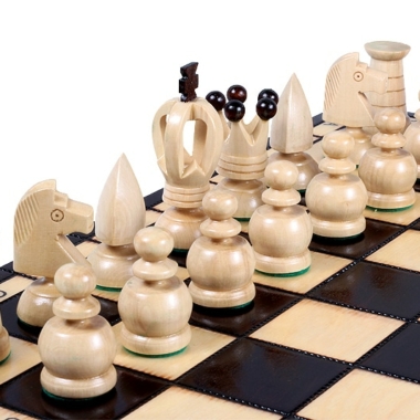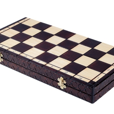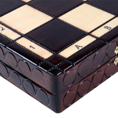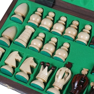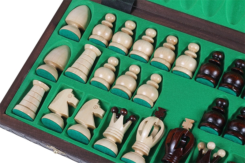 Sie sind kombiniert mit einem faltbaren Schachbrett aus Birke und Buche mit den Abmessungen 44 x 44 x 3 cm geöffnet (44 x 22 x 6 cm geschlossen). Es beinhaltet unter dem Spielbrett ein Aufbewahrungsfach, das es ermöglicht, die Schachfiguren zu lagern, sobald das Schachbrett zusammengeklappt ist.