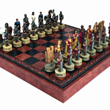 Schachspiel-Set im Thema des Trojanischen Krieges - Handbemalte Figuren und Schachbrett aus Kunstleder 48x48cm...