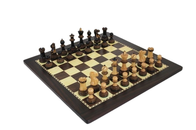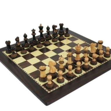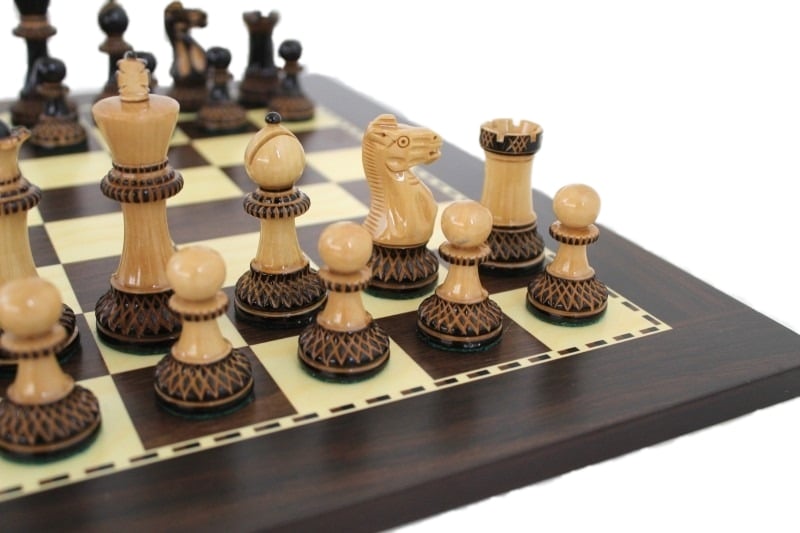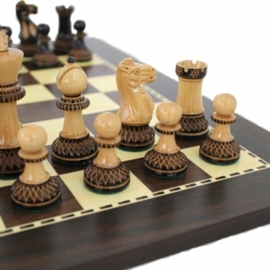 Schachspiel aus zweifarbigem Holz mit Holzbrett