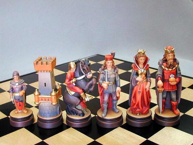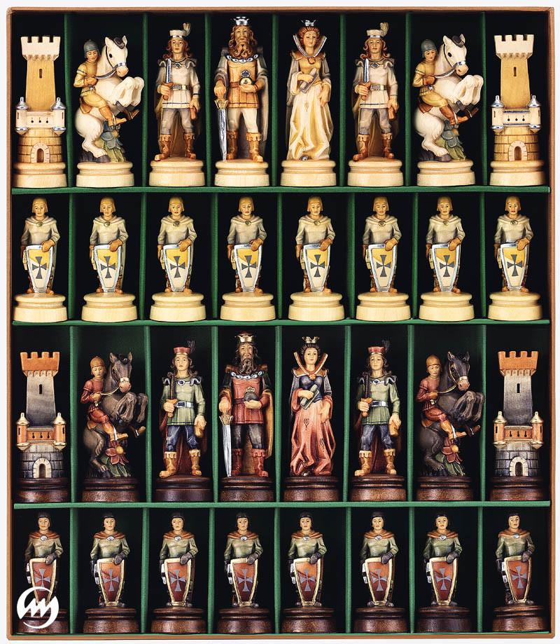 Ein Sammlerset von Schachfiguren, hergestellt von Fachkünstlern der Kunstschulen von Ortisei und Selva Gardena.