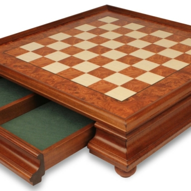 Das Schachbrett mit 61 x 61 cm besteht aus Ulmenholz und Wurzelholz, mit einem profilierten Rahmen und 4 gedrehten Füßen, es enthält eine Schublade zur Aufbewahrung der Schachfiguren.
