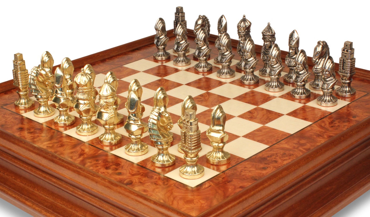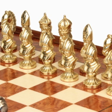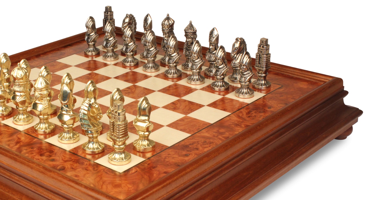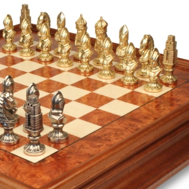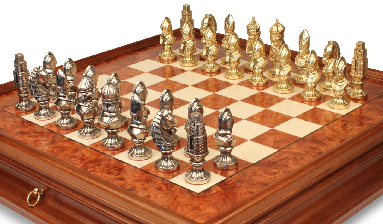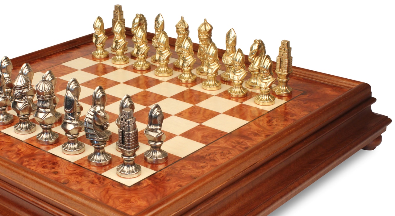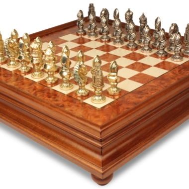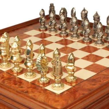 Schachspiel Moncada – Schachbrett aus Wurzelholz und Ulmenholz mit Schublade & Metallfiguren