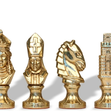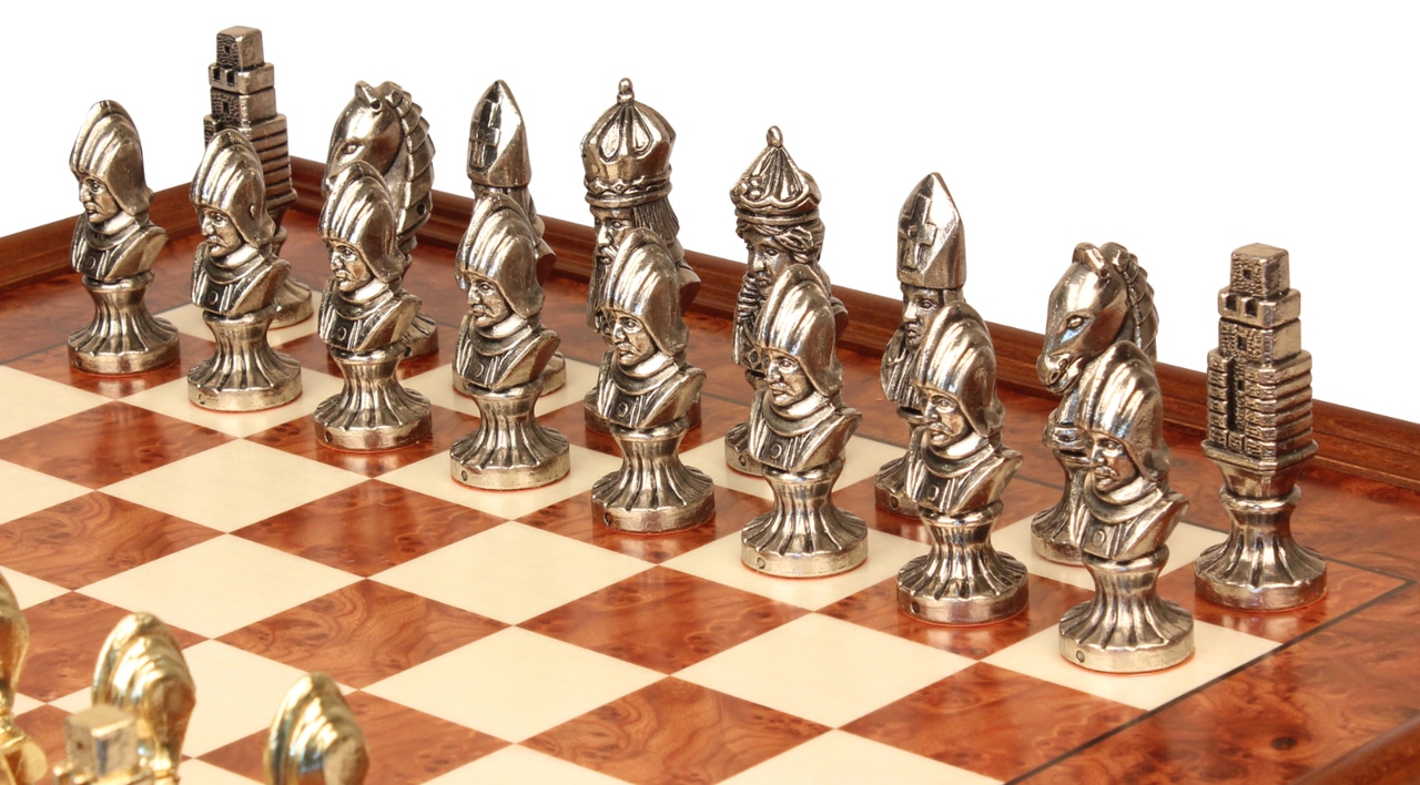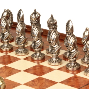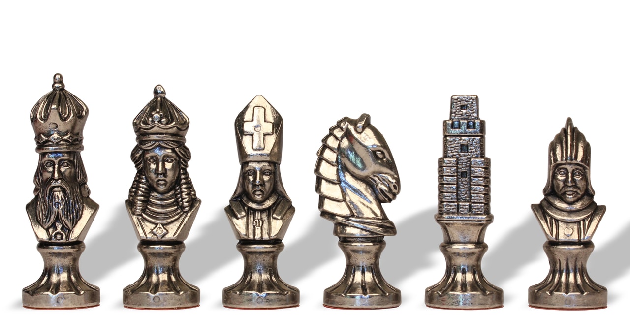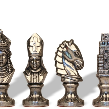 Das Schachspiel Moncada besteht aus Metallfiguren, die an ein Stück spanische Geschichte des 15. Jahrhunderts erinnern. Vollständig von Hand geschnitzt und poliert haben sie eine Königshöhe von 9,3 cm.