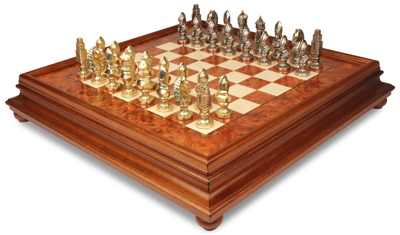 Zeitgenössisches Schachspiel - Schachbrett aus Wurzelholz und Ulmenholz mit Schublade & Metallfiguren...