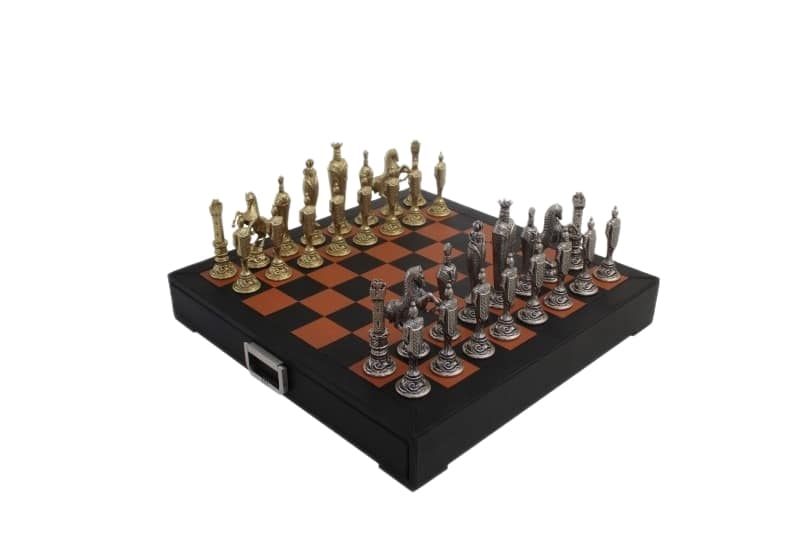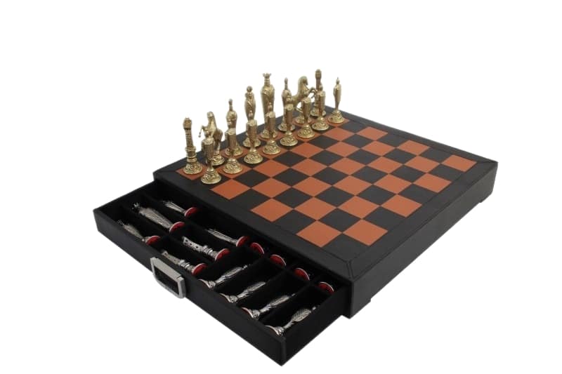 Schachspiel Renaissance Florentin aus Metall & echtes Leder-Schachbrett mit Aufbewahrungsschublade
