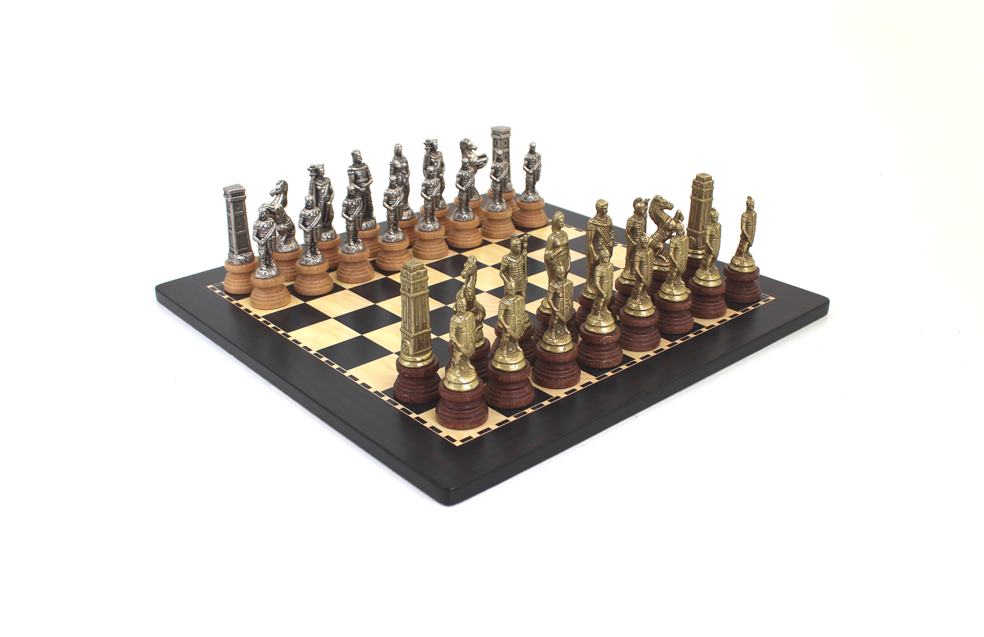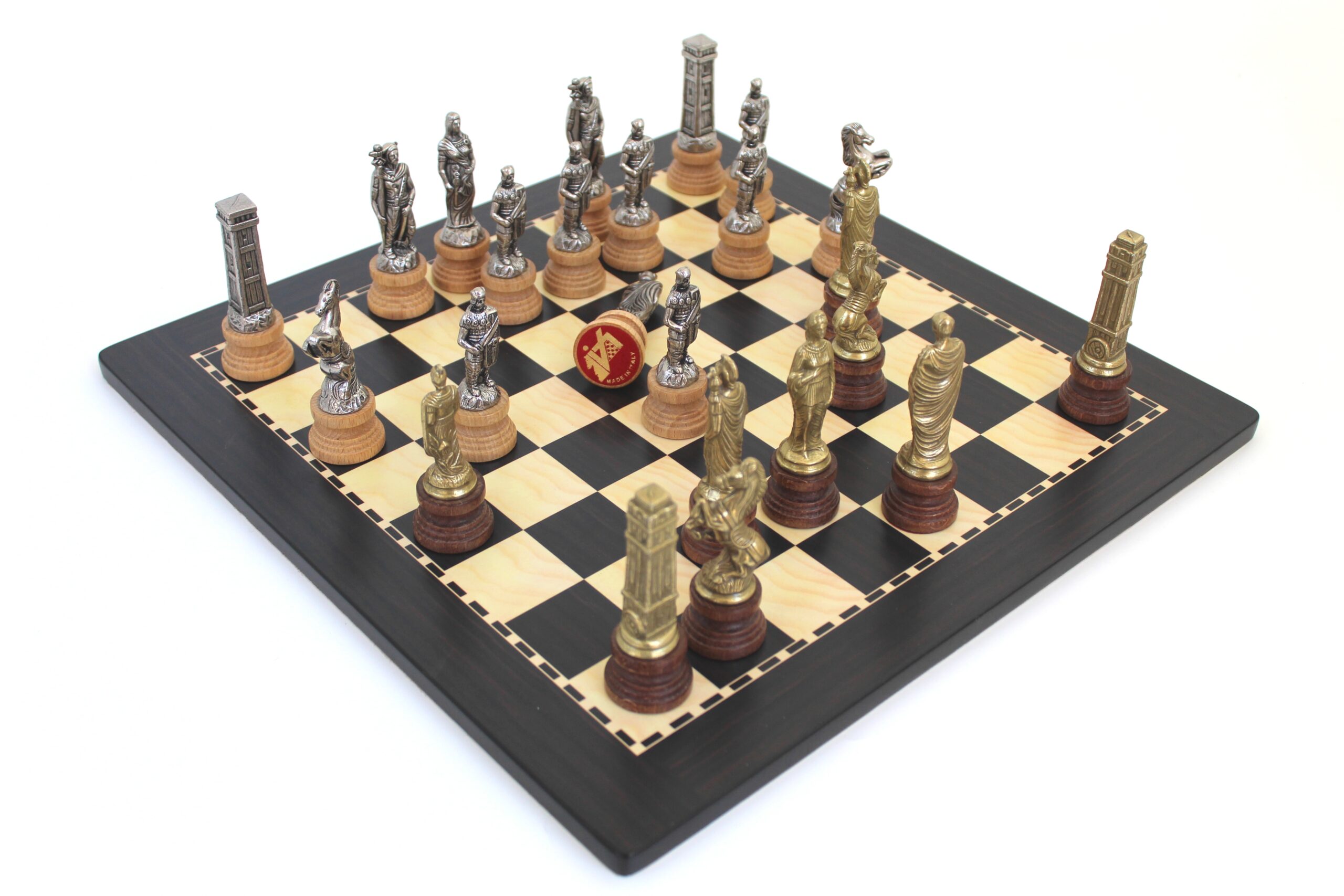 Die Schachfiguren sind im Thema der Schlacht der Römer gegen die Barbaren gestaltet. Vollständig von Hand aus Metall gefertigt, stehen sie auf einem Holzsockel. Mit einer Könighöhe von 9,9 cm sind sie gut gewichtet.