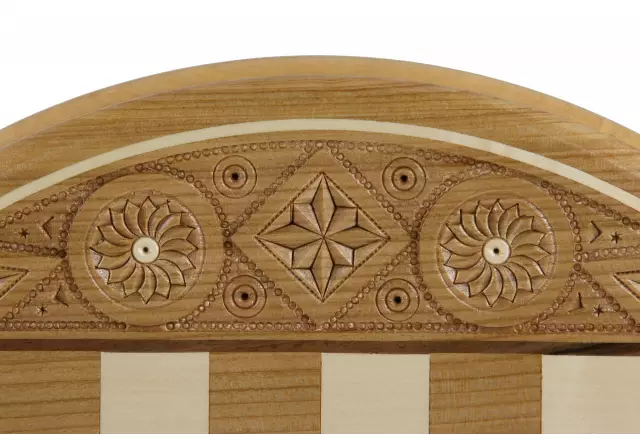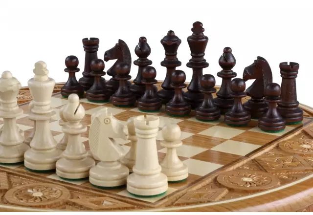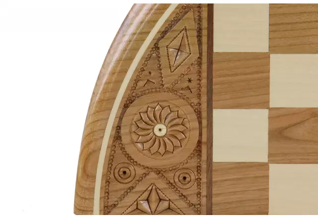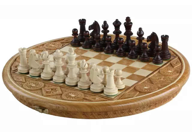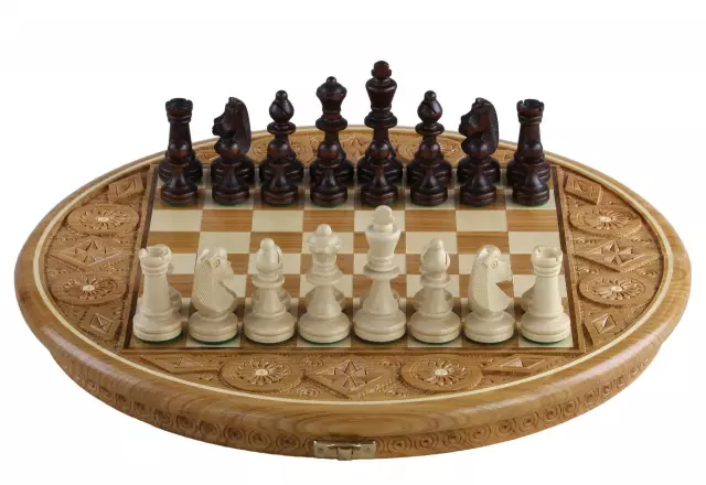 Der König mit einer Höhe von 7 cm überragt elegant die anderen fein gearbeiteten Figuren. Das 34,5 cm große runde Schachbrett besticht durch sein originelles Design und die perfekt proportionierten Felder von 2,7 cm.