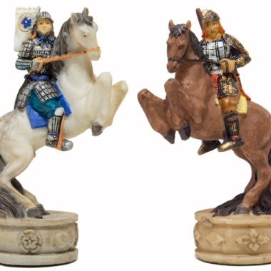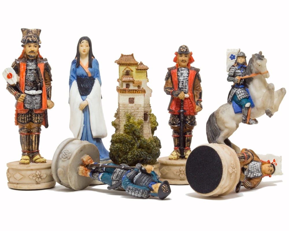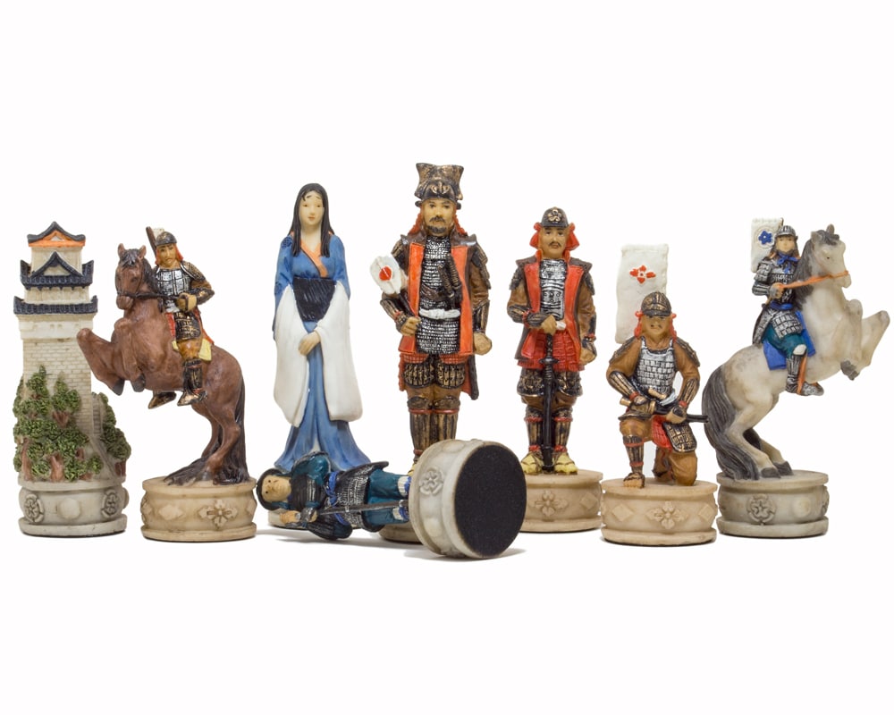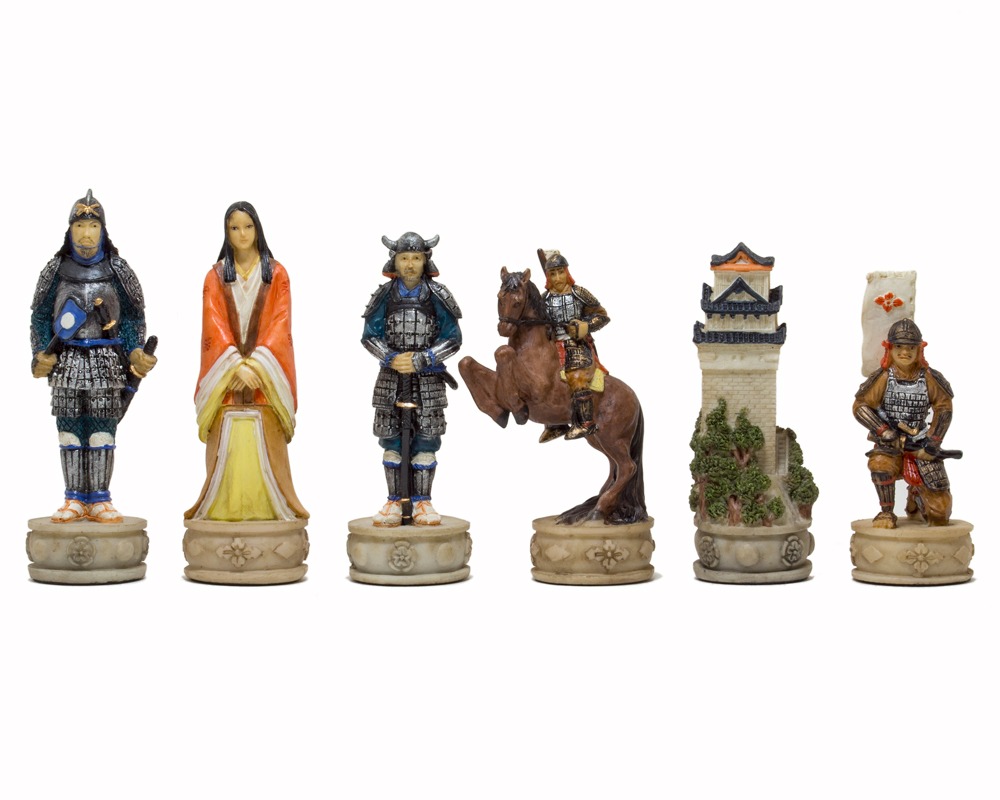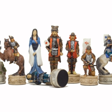 Die Schachfiguren aus Resin sind inspiriert von den japanischen Samurai. Mit einer Könighöhe von 8 cm sind sie vollständig handbemalt.
