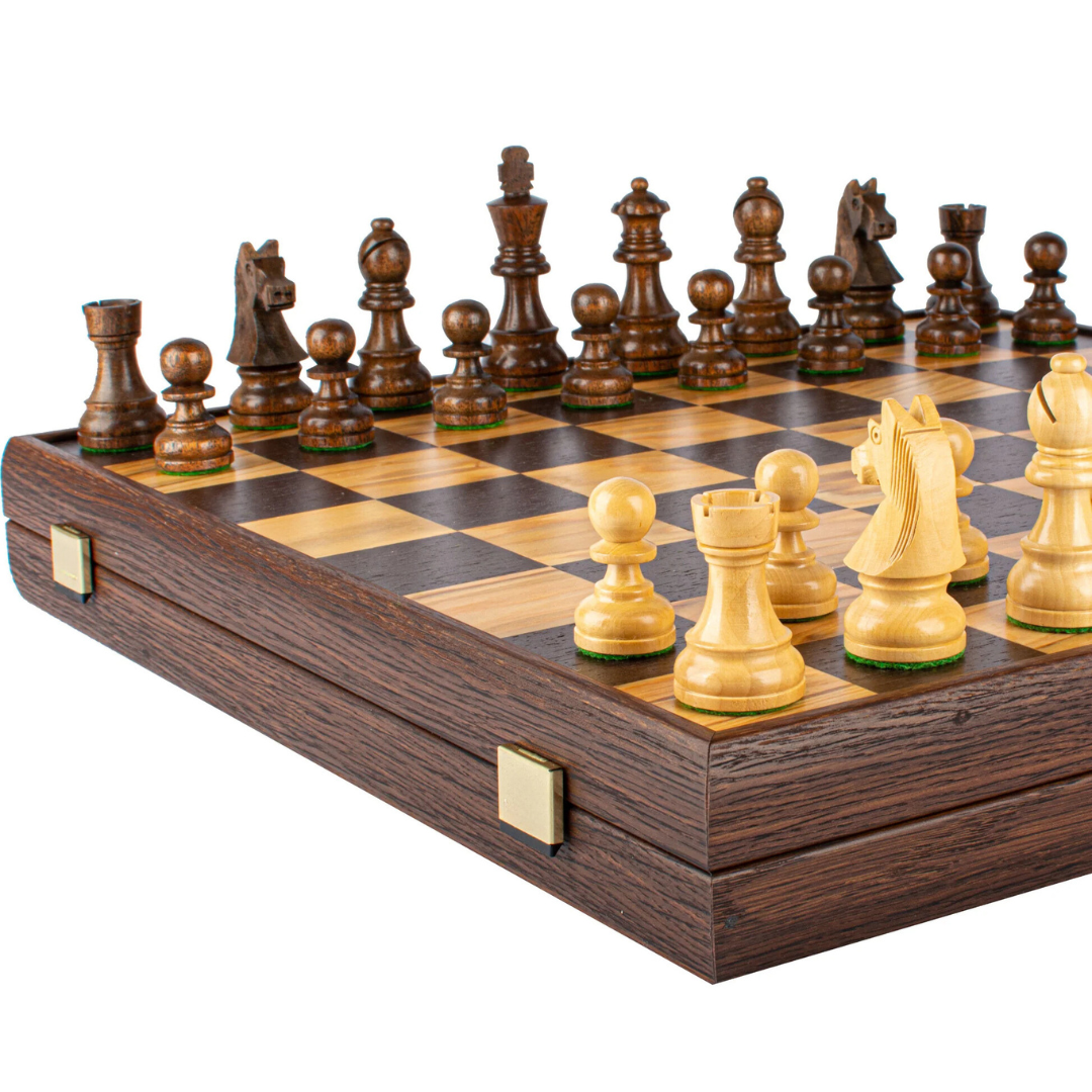 Schachspiel-Set aus Rosenholz und Buchsbaum sowie Schachbrett aus Olivenwurzel und Wenge mit Aufbewahrung – 43 x 43 cm