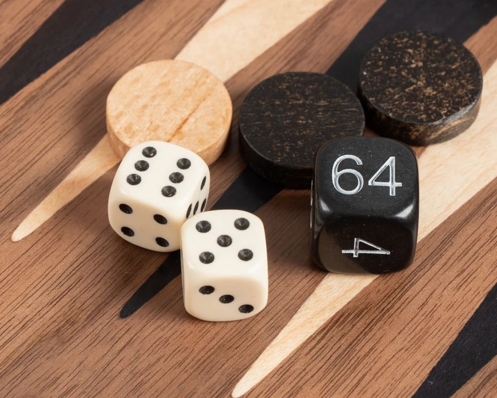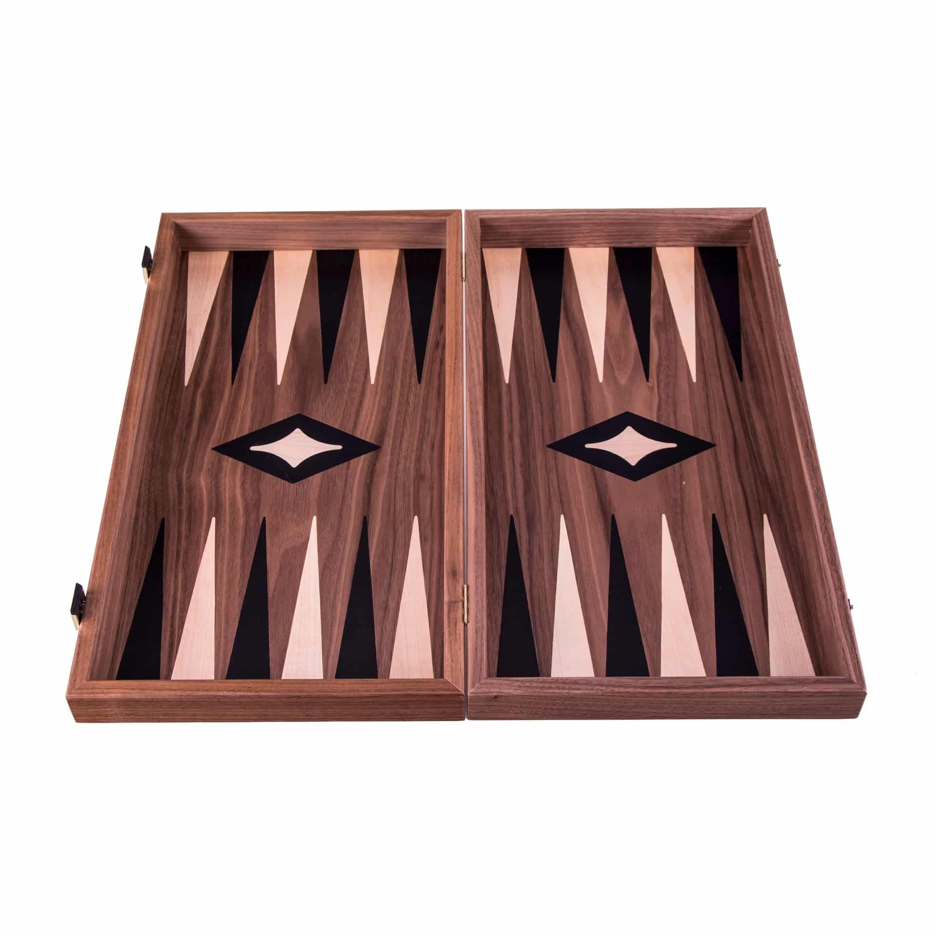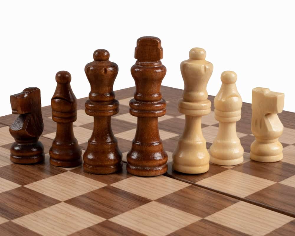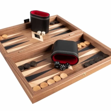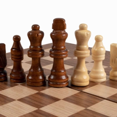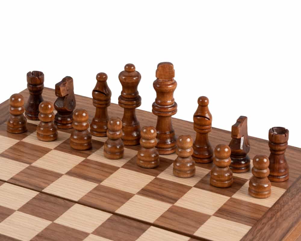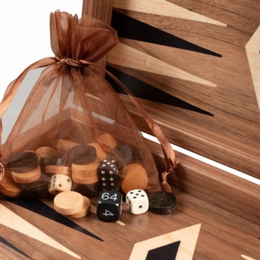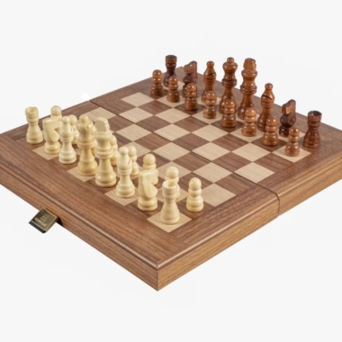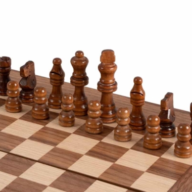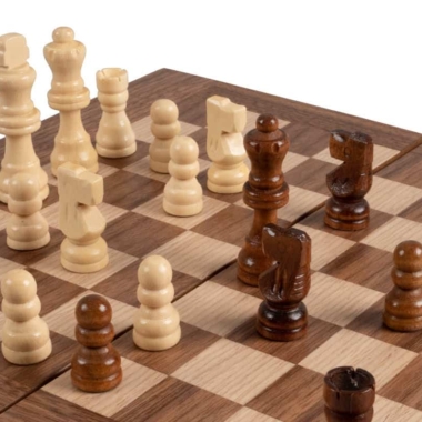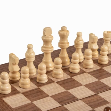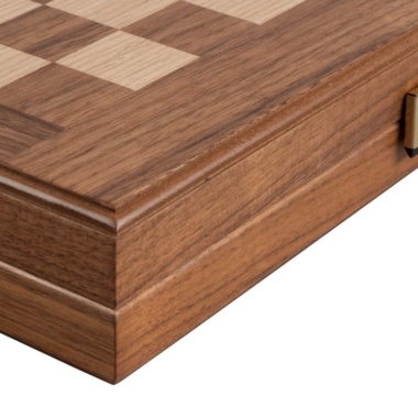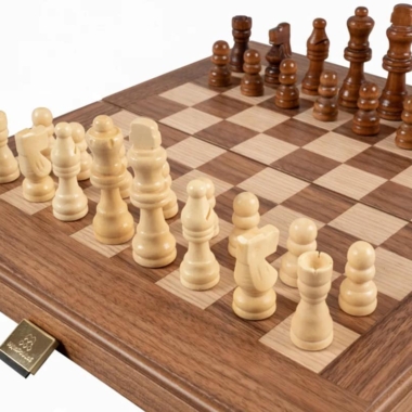Die Schachfiguren aus Holz sowie die Damespiere aus Kunststoff mit Perleffekt sind enthalten. Das Brett kombiniert Nussbaum mit schwarzen Eichenakzenten und schafft einen raffinierten und harmonischen Kontrast.