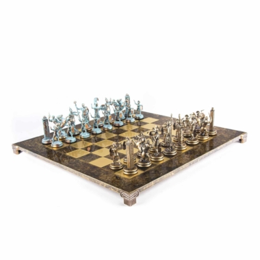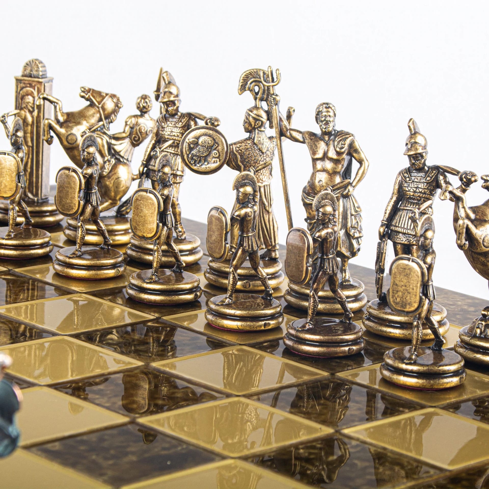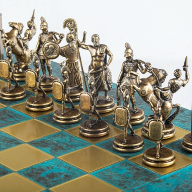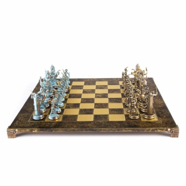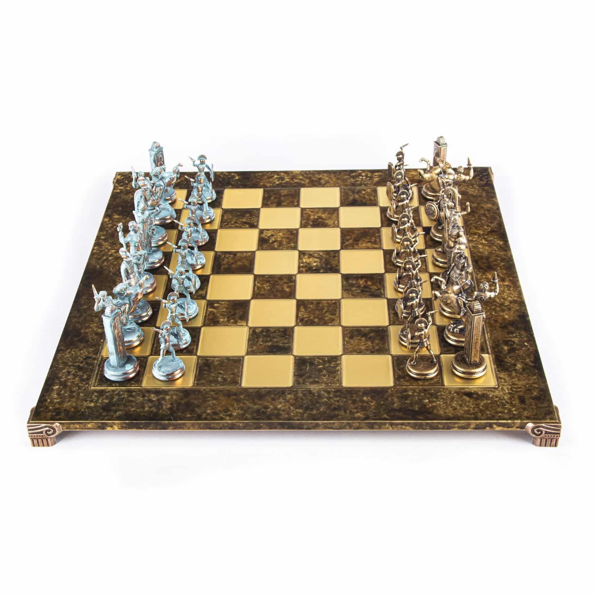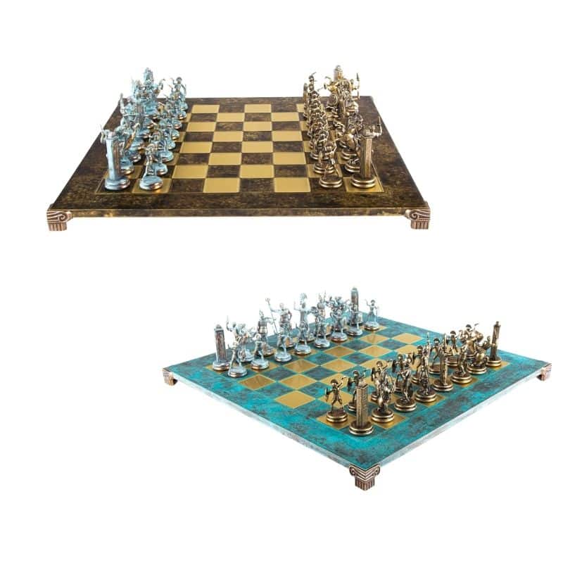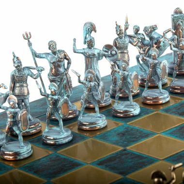 Schachspiel-Set der griechischen Mythologie – Stücke aus blauem und bronzenem Metall