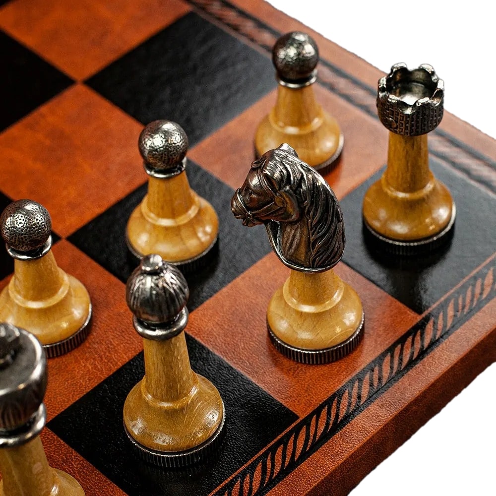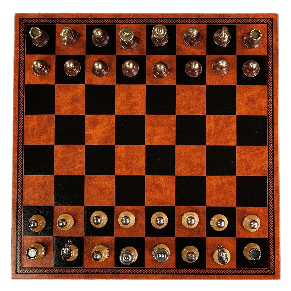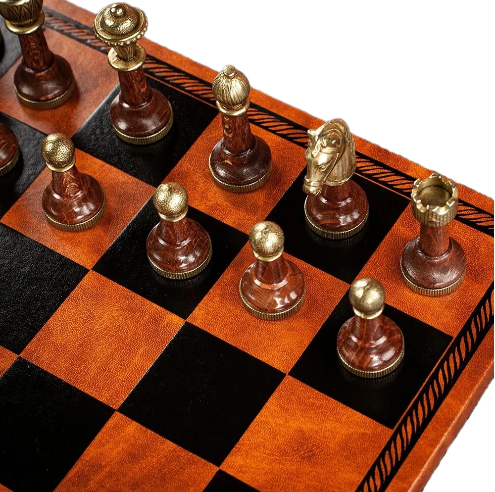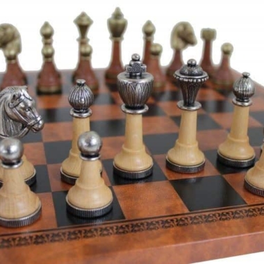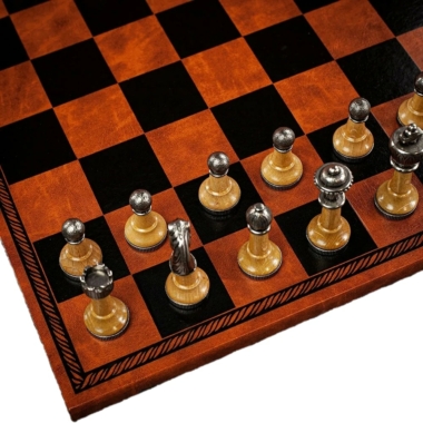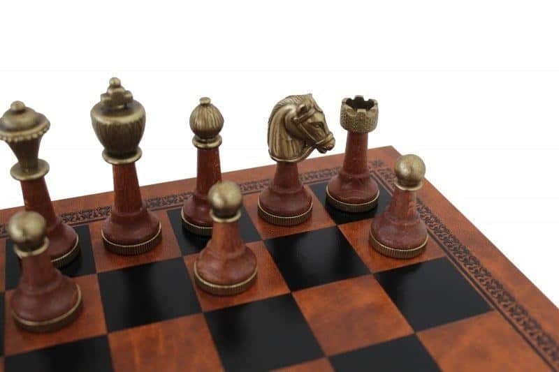Schachspiel Staunton aus Metall und Holz mit Schachbrett aus Kunstleder in Braun