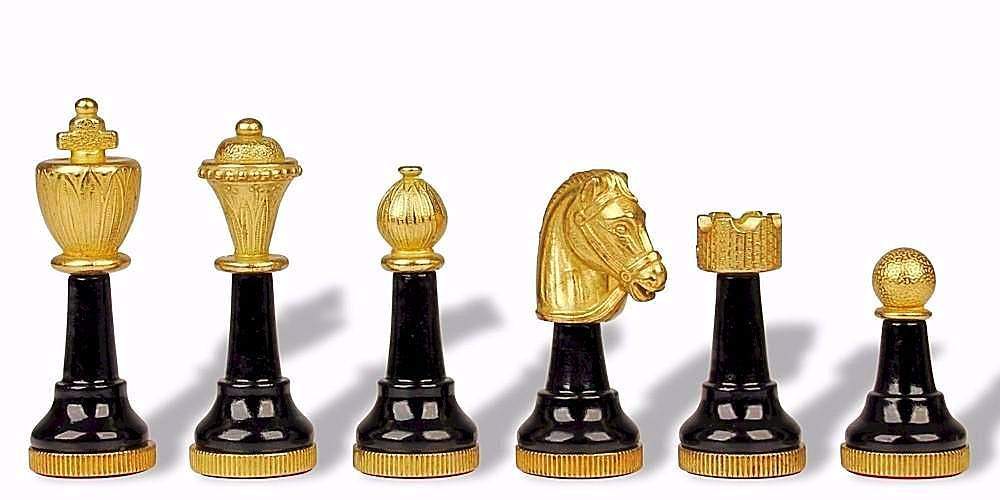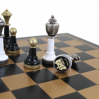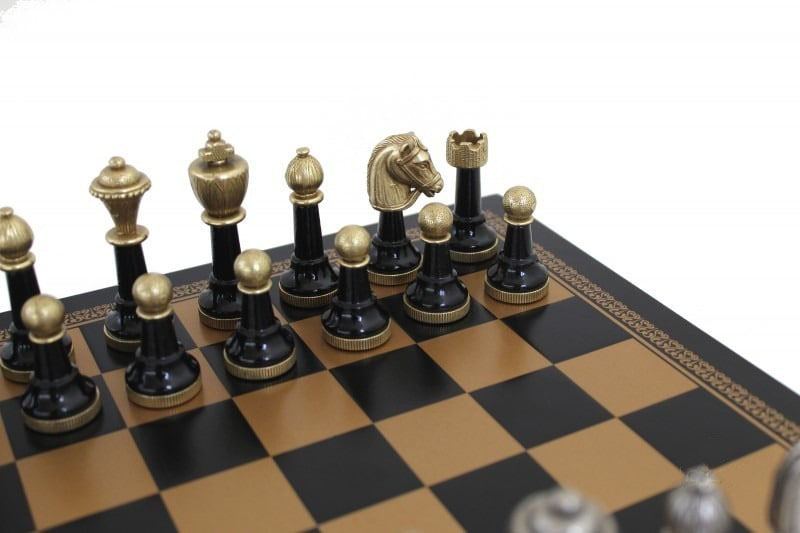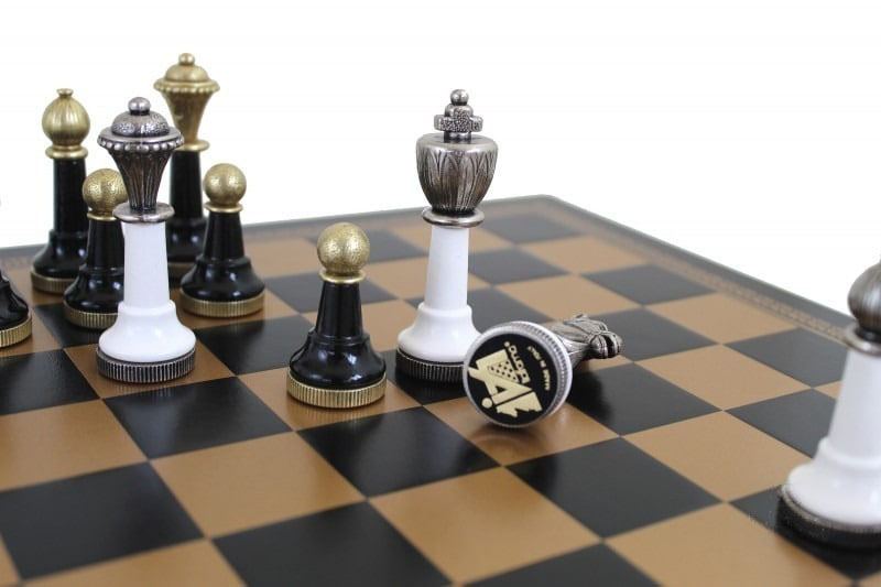 Sie sind passend zu einem Schachbrett aus Kunstleder in Schwarz und Gold mit den Abmessungen 33 x 33 cm.